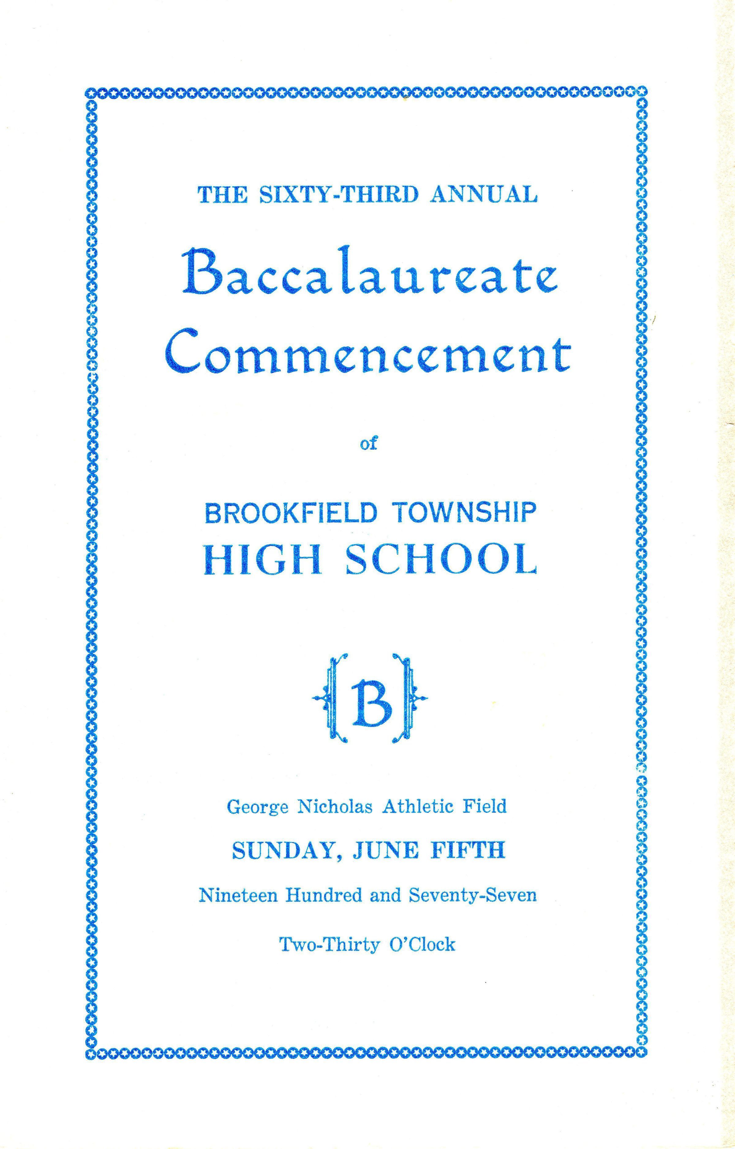 Program for Brookfield High School 63rd Annual Baccalaureate Commencement. Graduating Class of 1977.