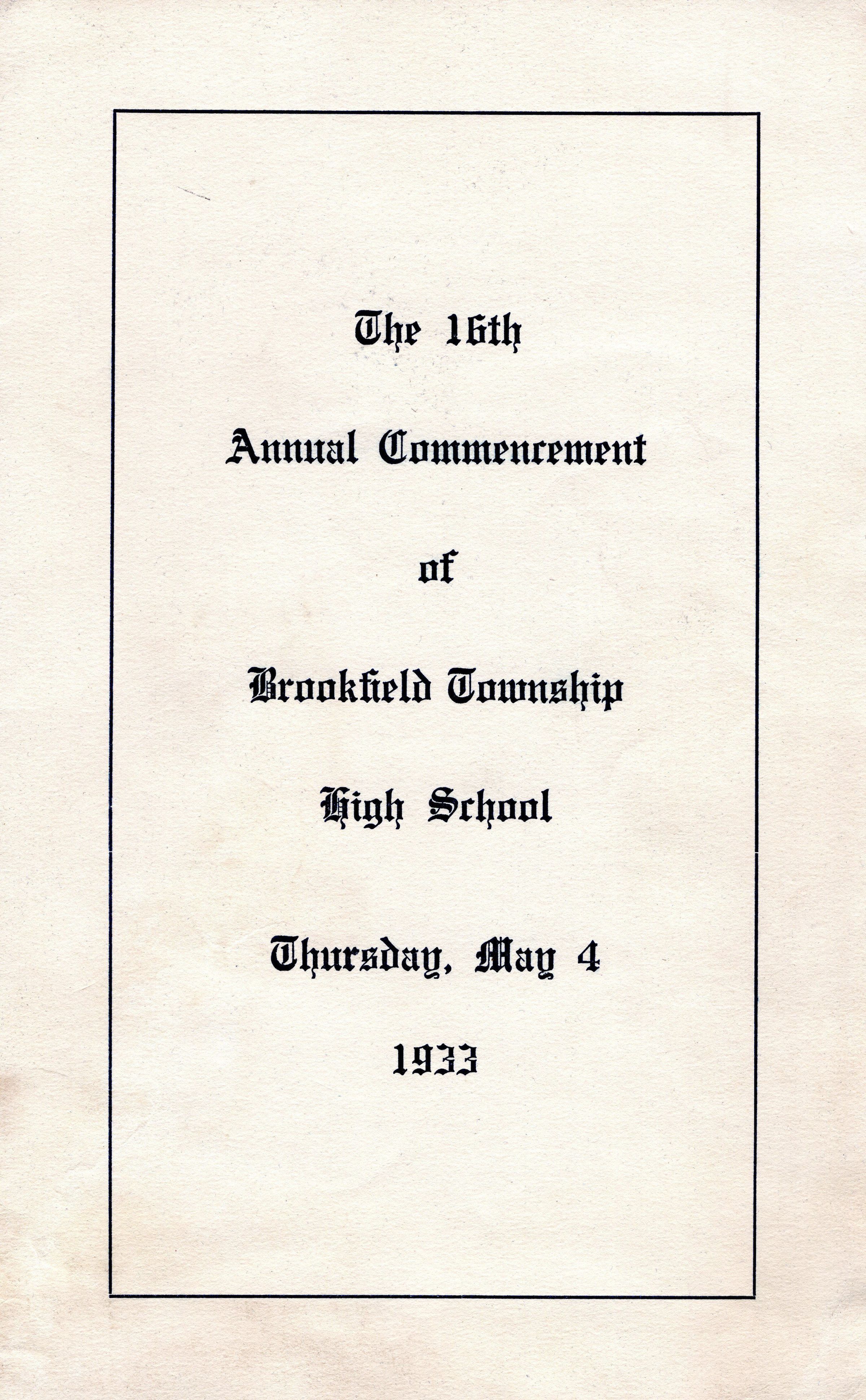 Brookfield High School Graduation program for Class of 1933. 16th annual commencement. 2 copies