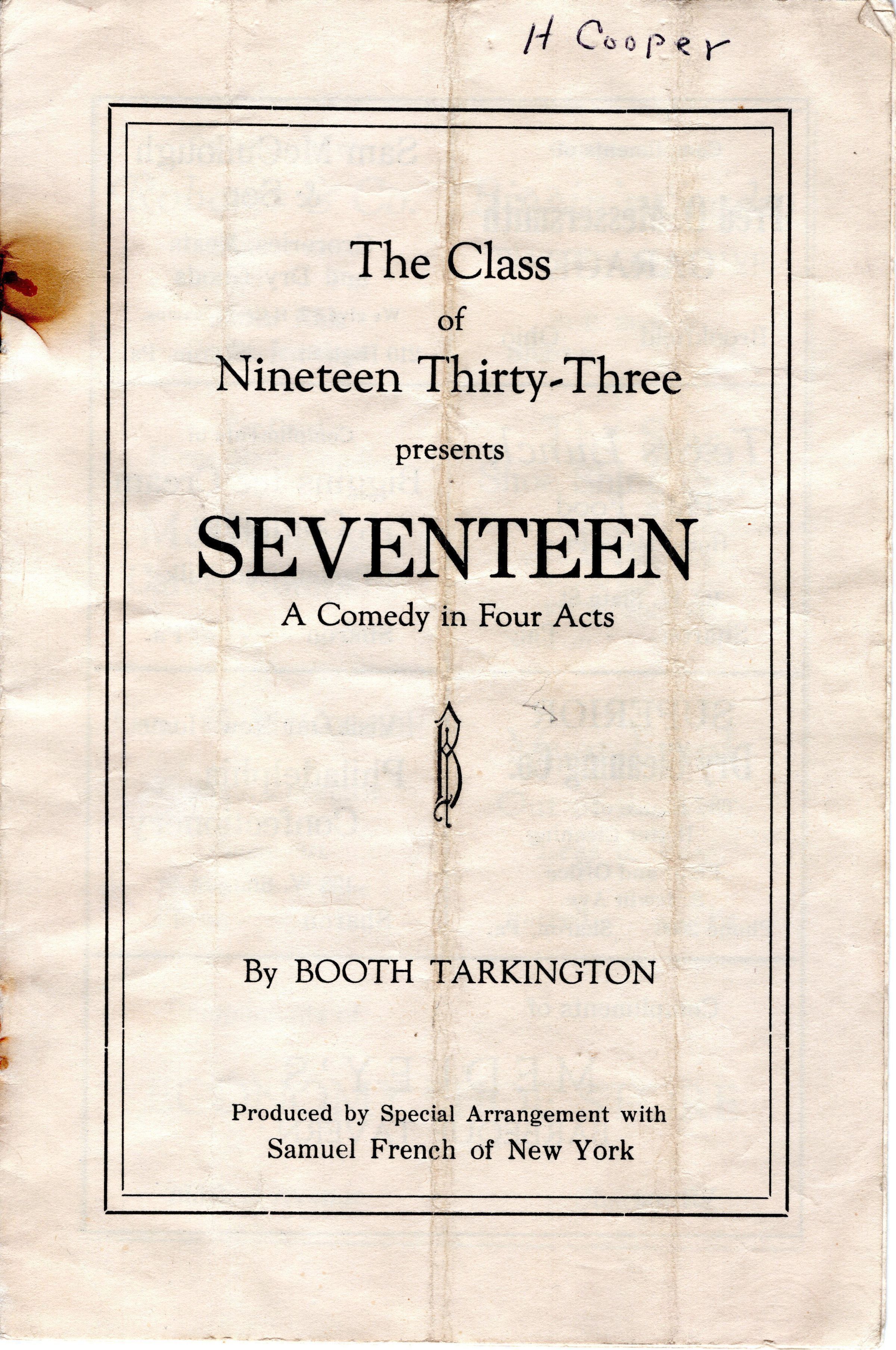 Program for school play "Seventeen", Class of 1933. Harold Cooper.