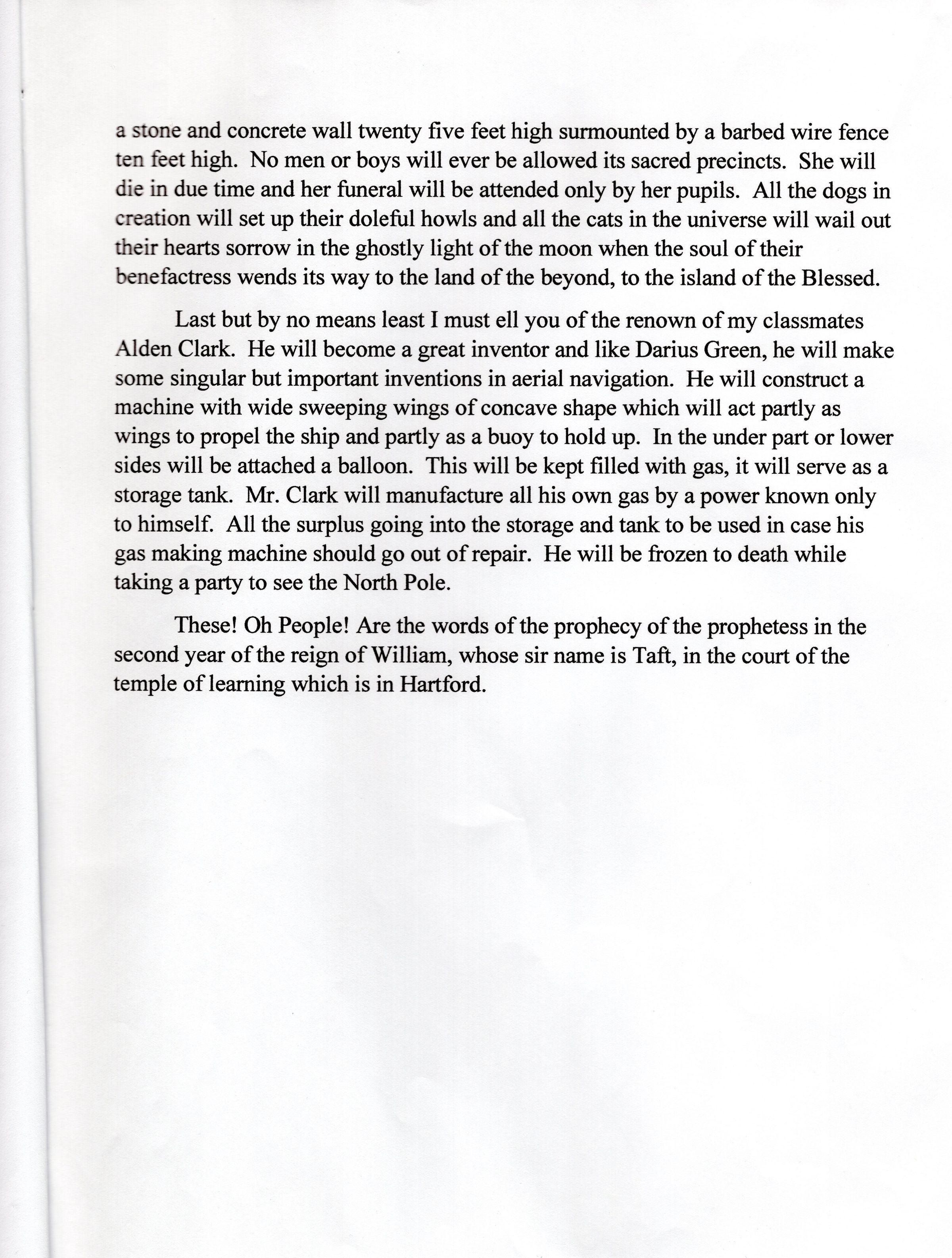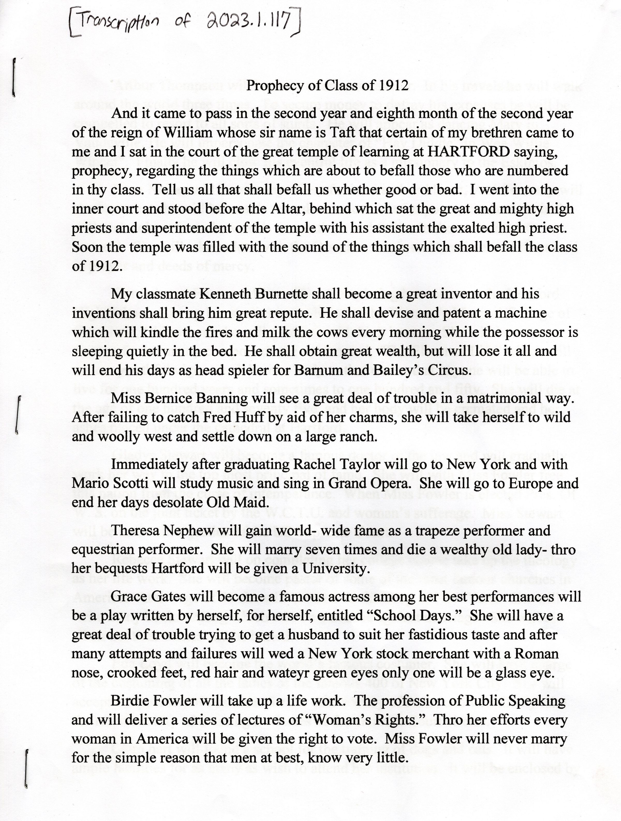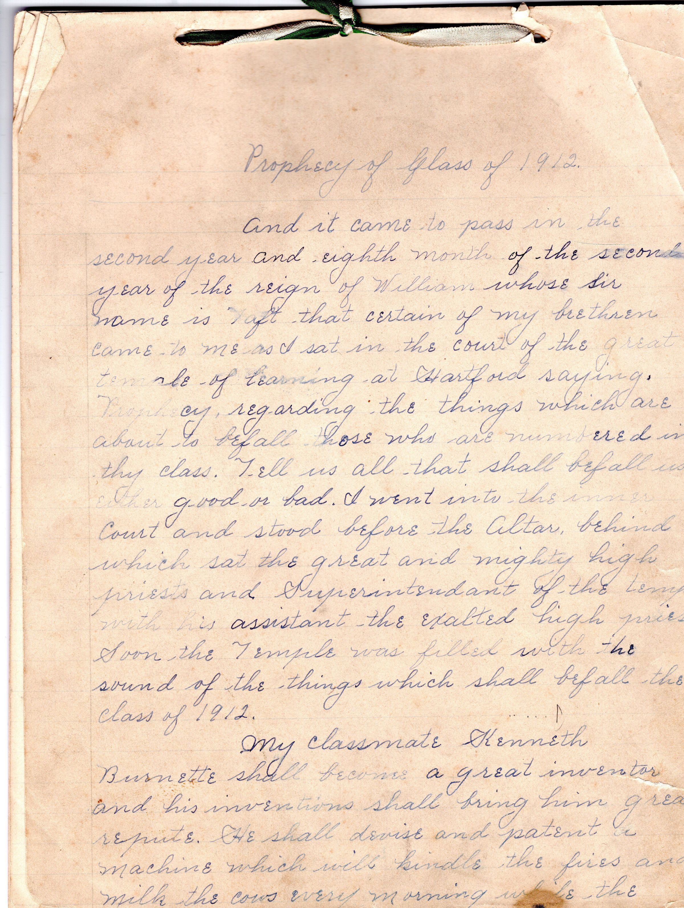 A handwritten copy of the Prophecy of the Class of 1912 and a transcription.