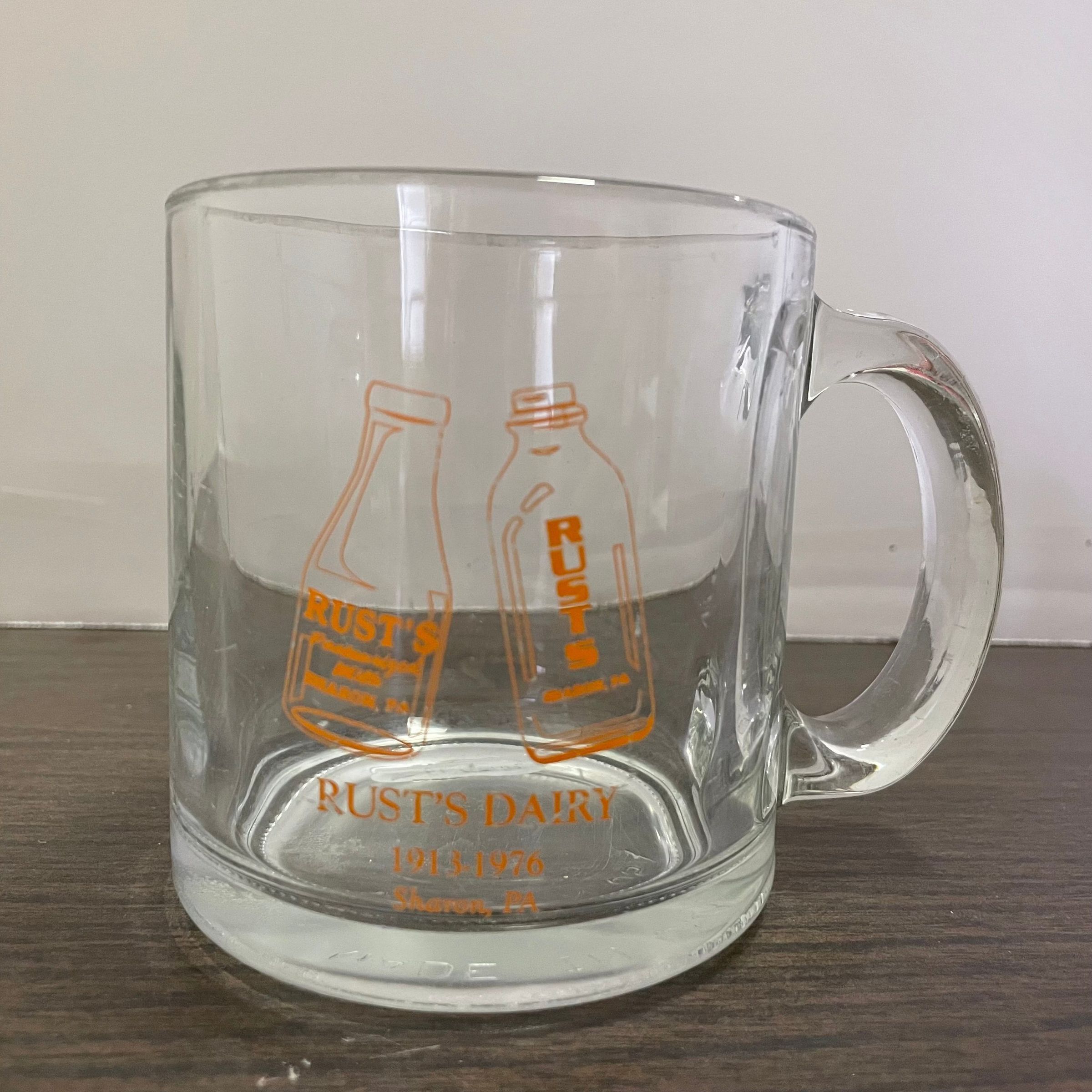 Glass mug with the words "Rust's Dairy / 1913-1976 / Sharon, PA" and image of a milk bottle in orange.