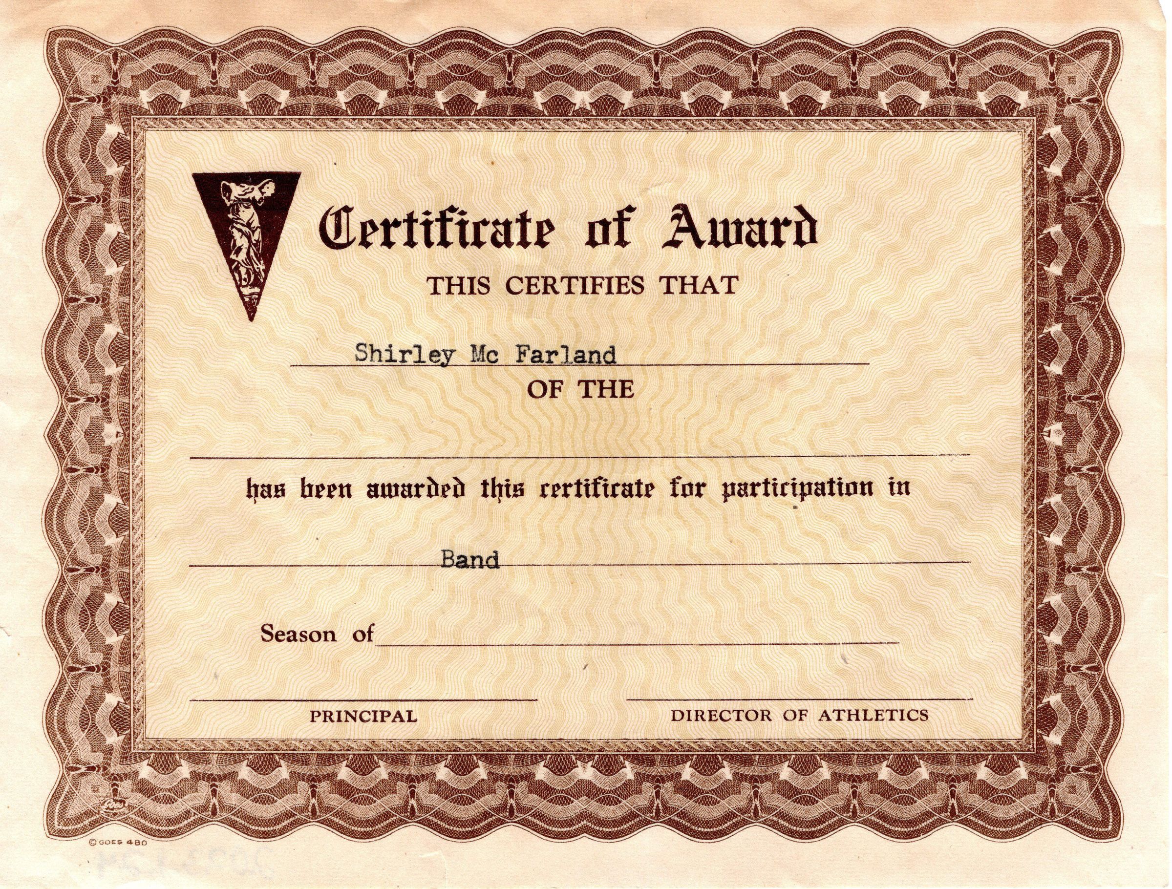 Certificate of Award for Shirley McFarland for participation in band. Missing signatures of principal and director of athletics.