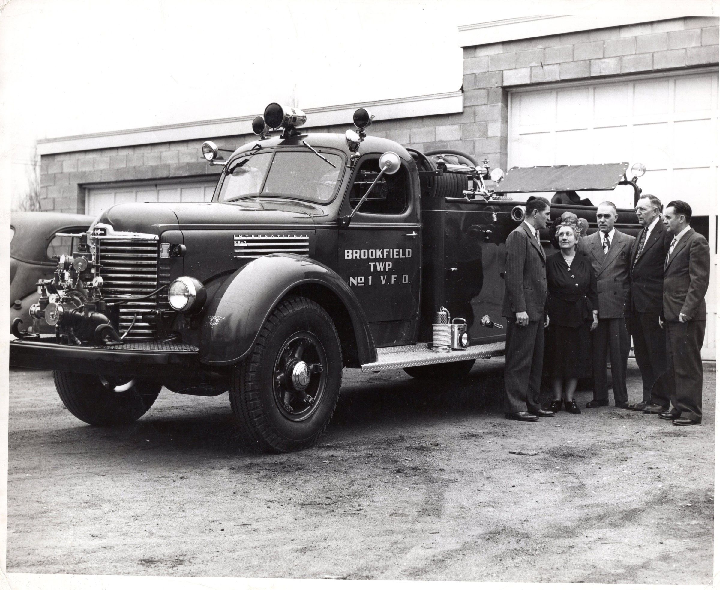 Trustees presenting No. 1 pumper to Chief Schultz in February 1949. Pictured left to right: Steve Boor, Mary Hummell, Ernest Wright, John Coppage and Rhinold Schultz