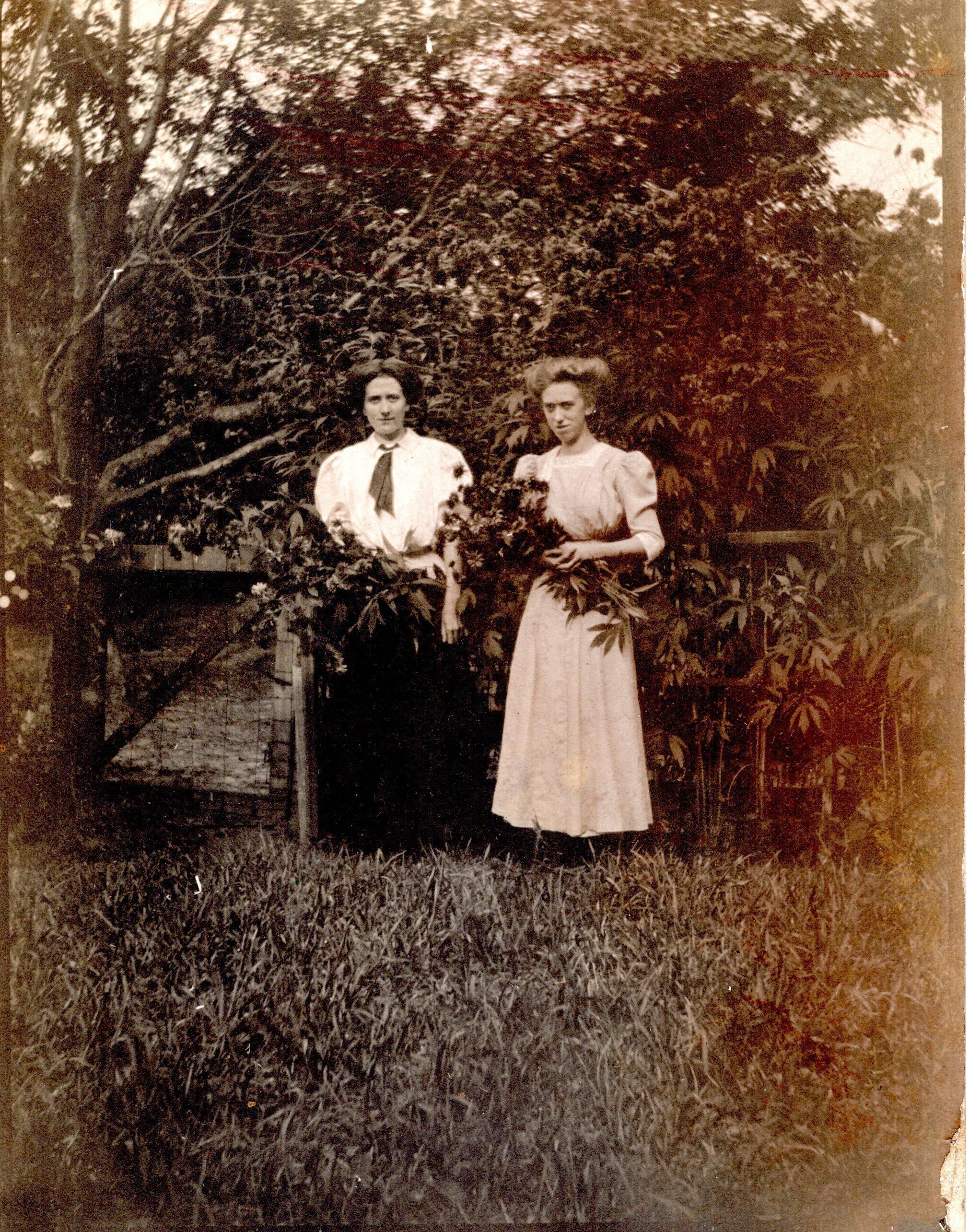 Photo of 2 unidentified women holding flowers outside.
