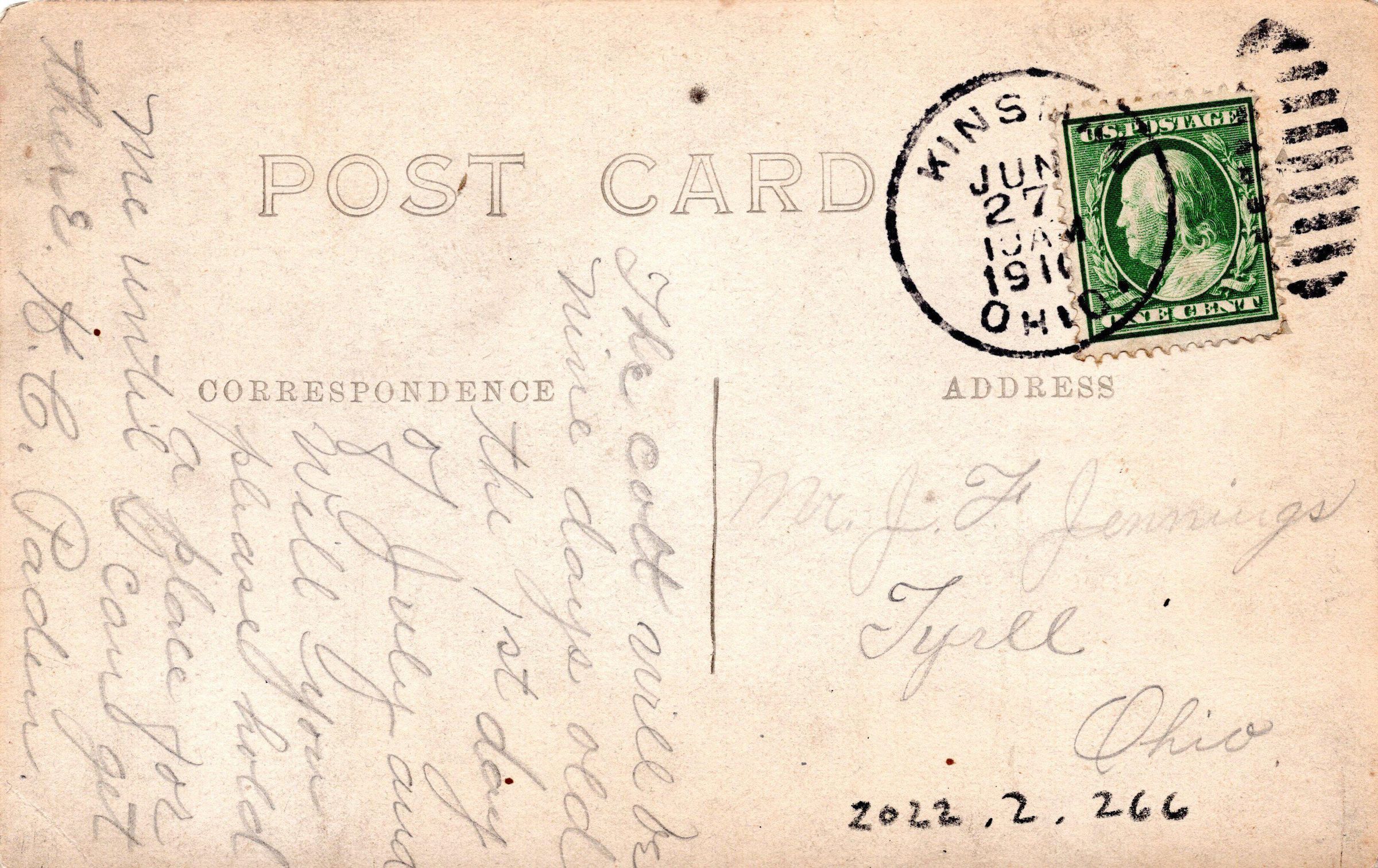 A postcard sent in 1910 to Mr. F Jennings in Tyrll, Ohio from H.C. Paden. The image on the front is believed to be a school building.
