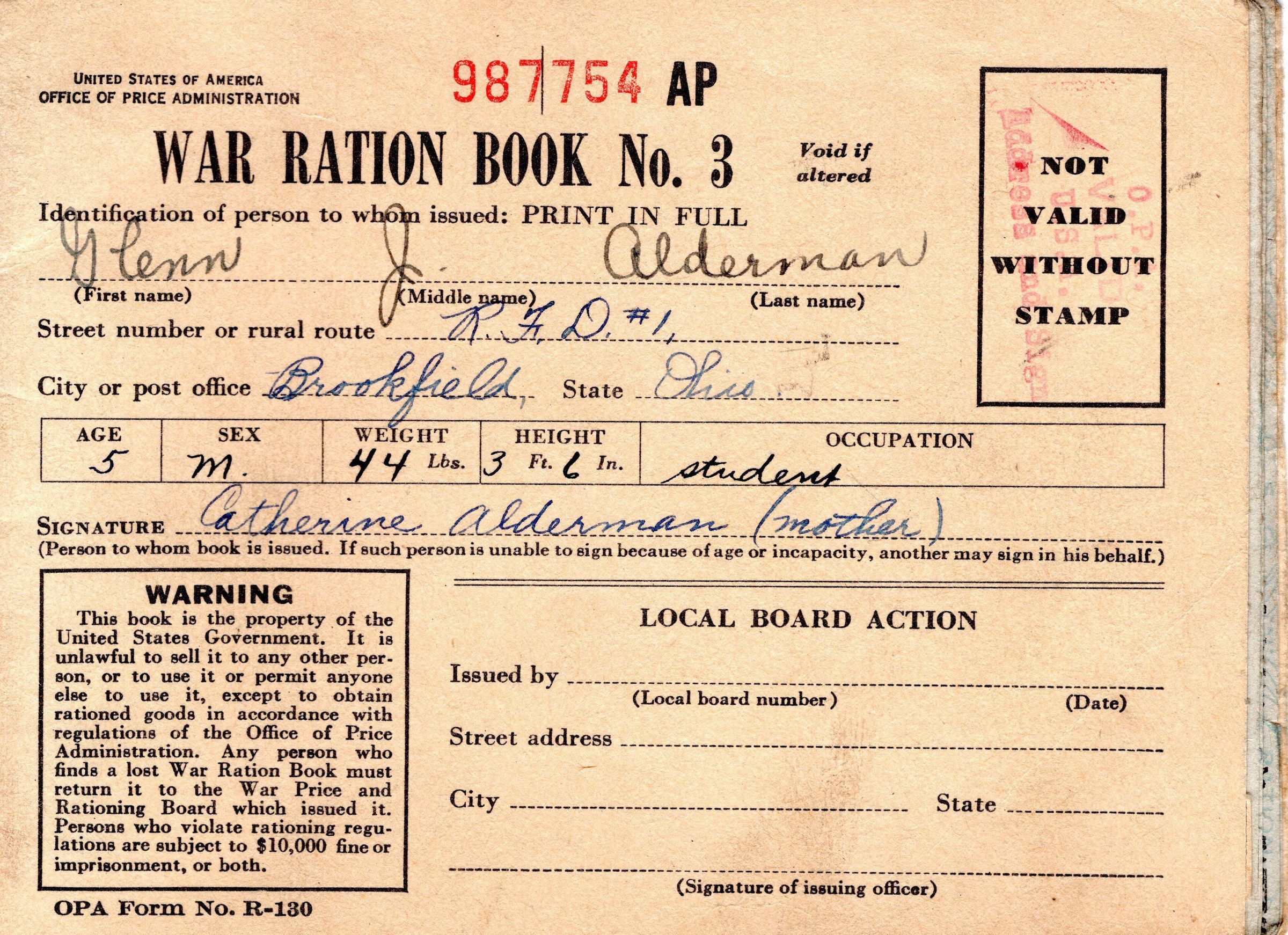 War Ration Book 3 issued to Glenn John Alderman age 5.