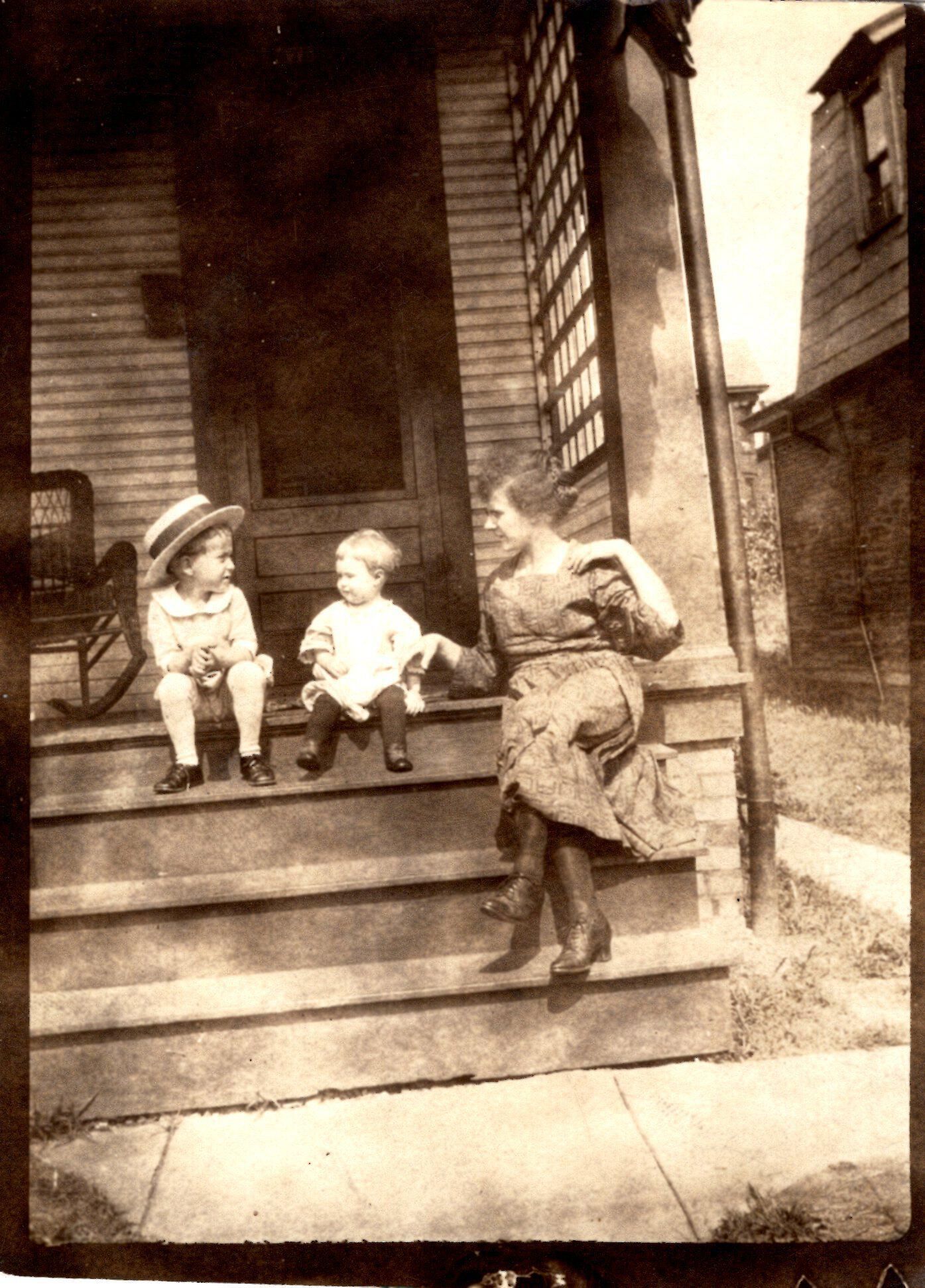Photo of unidentified woman and two children on steps.