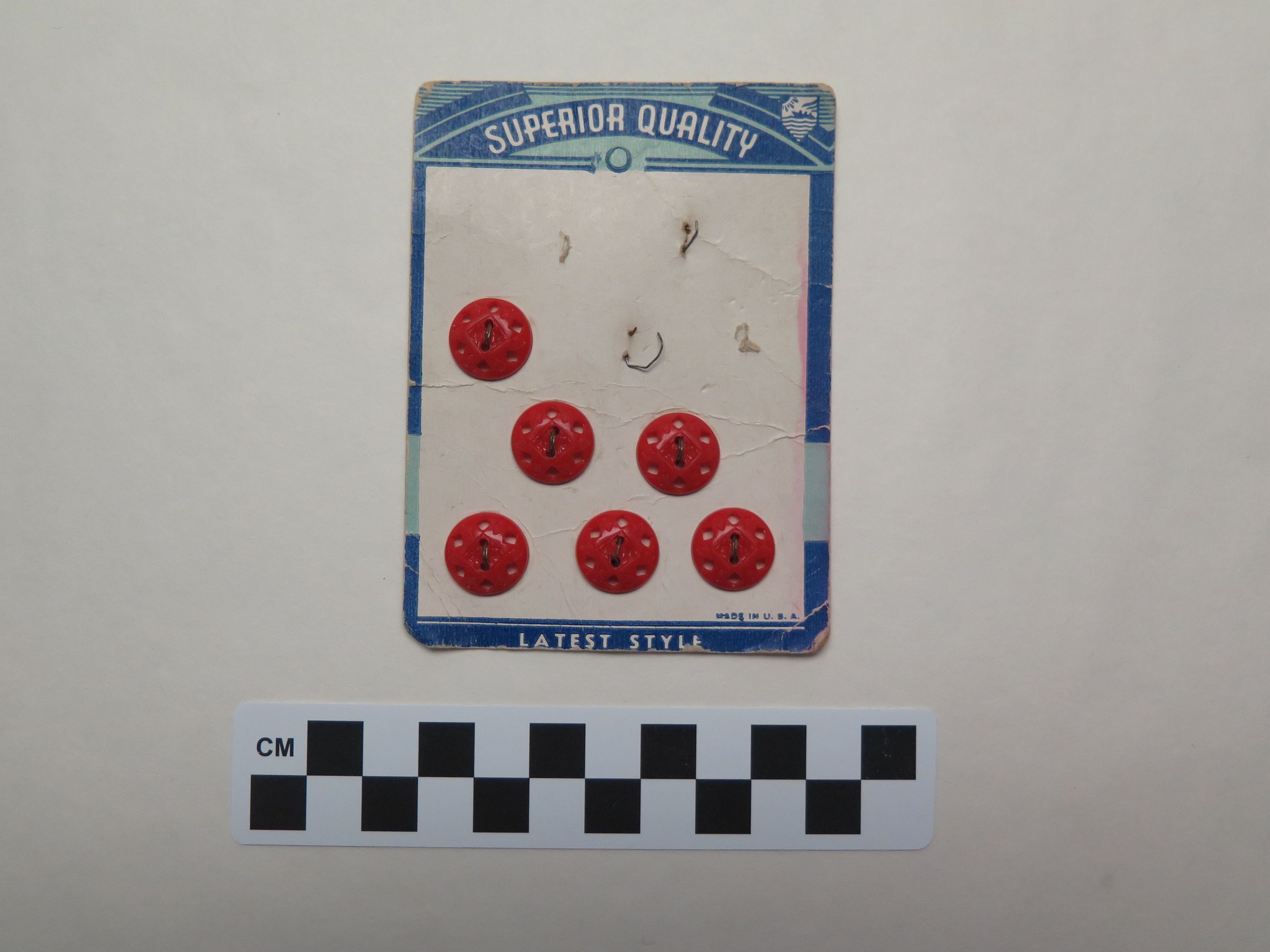This is a card with 6 red Superior Quality brand buttons on it. The card measures 3" (w) x 4" (l).