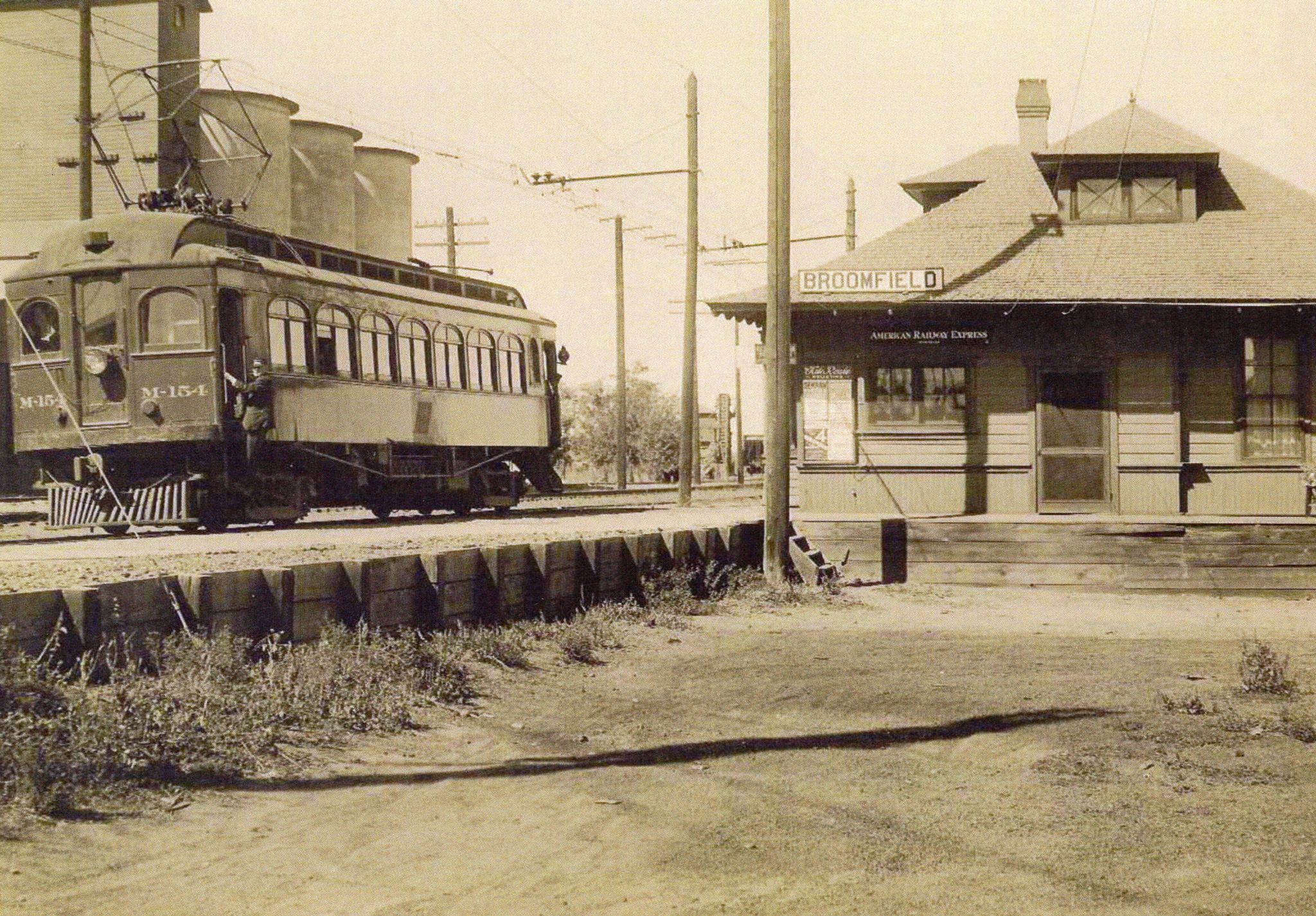 Broomfield Depot with Denver Interurban train car, c. 1910-1920.