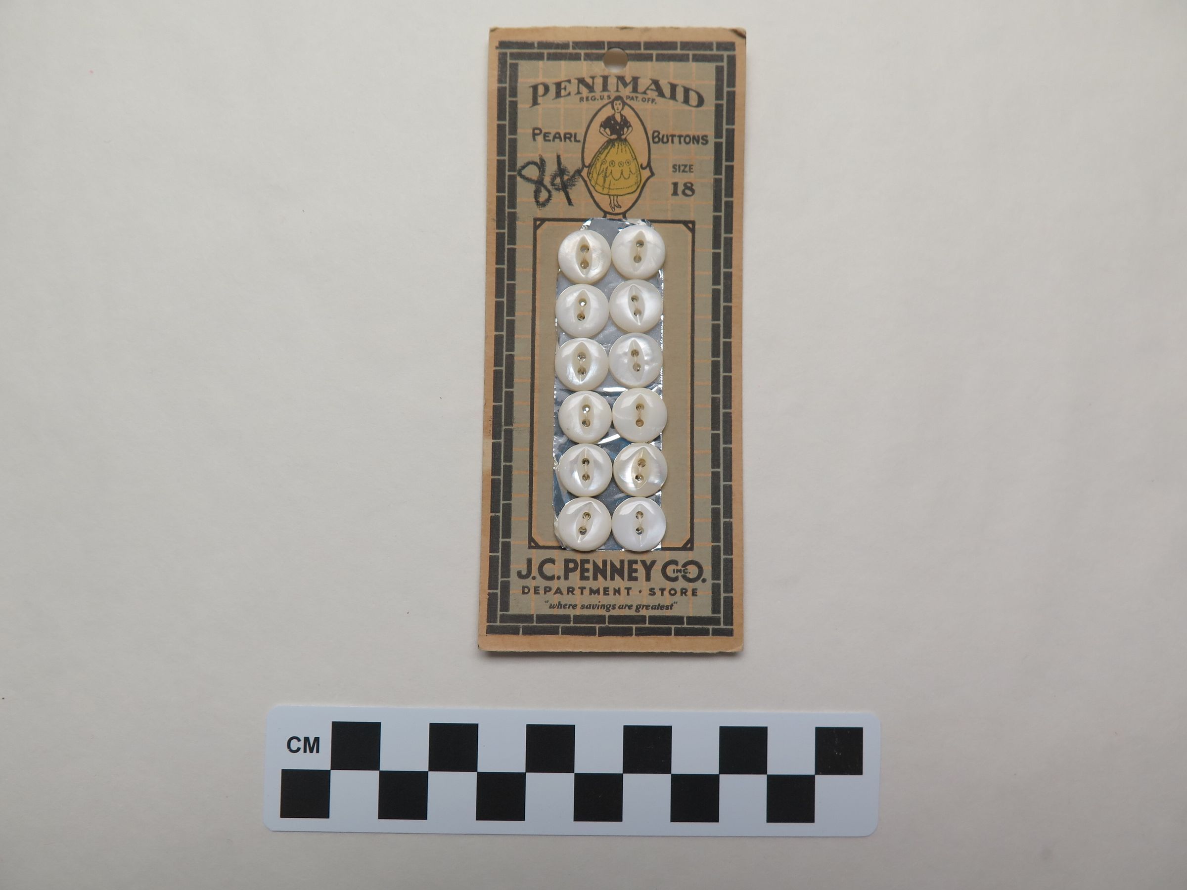 This is a card with 12 Pennimaid brand pearl buttons on it sold by J.C. Penny. The card measures 2" (w) x 5" (l).