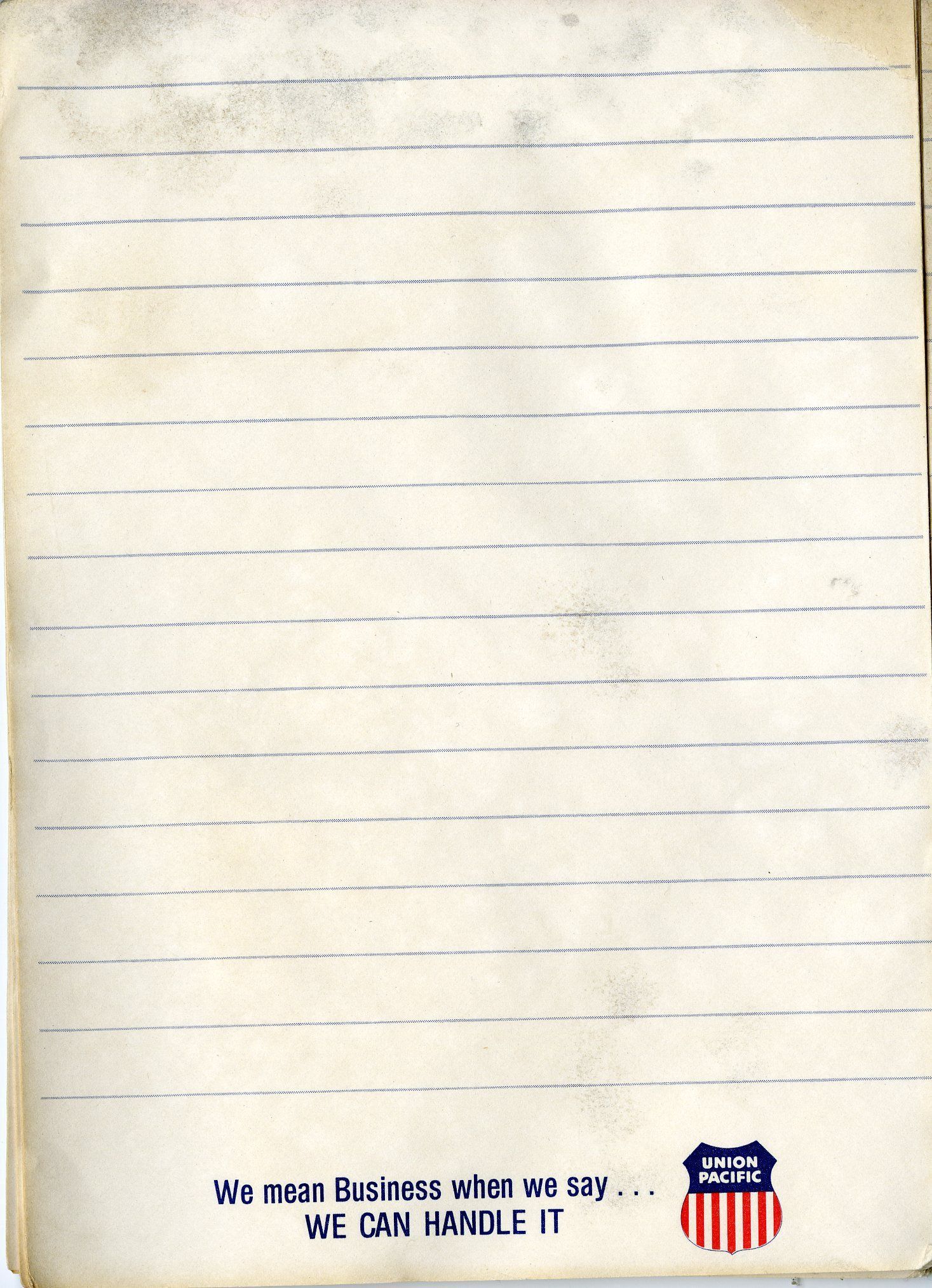 One Union Pacific Railroad notepad, circa 1950s. The pad is 5" x 7," lined, blank, and heavily used. One sheet has rips and tears, and is separate from the pad.