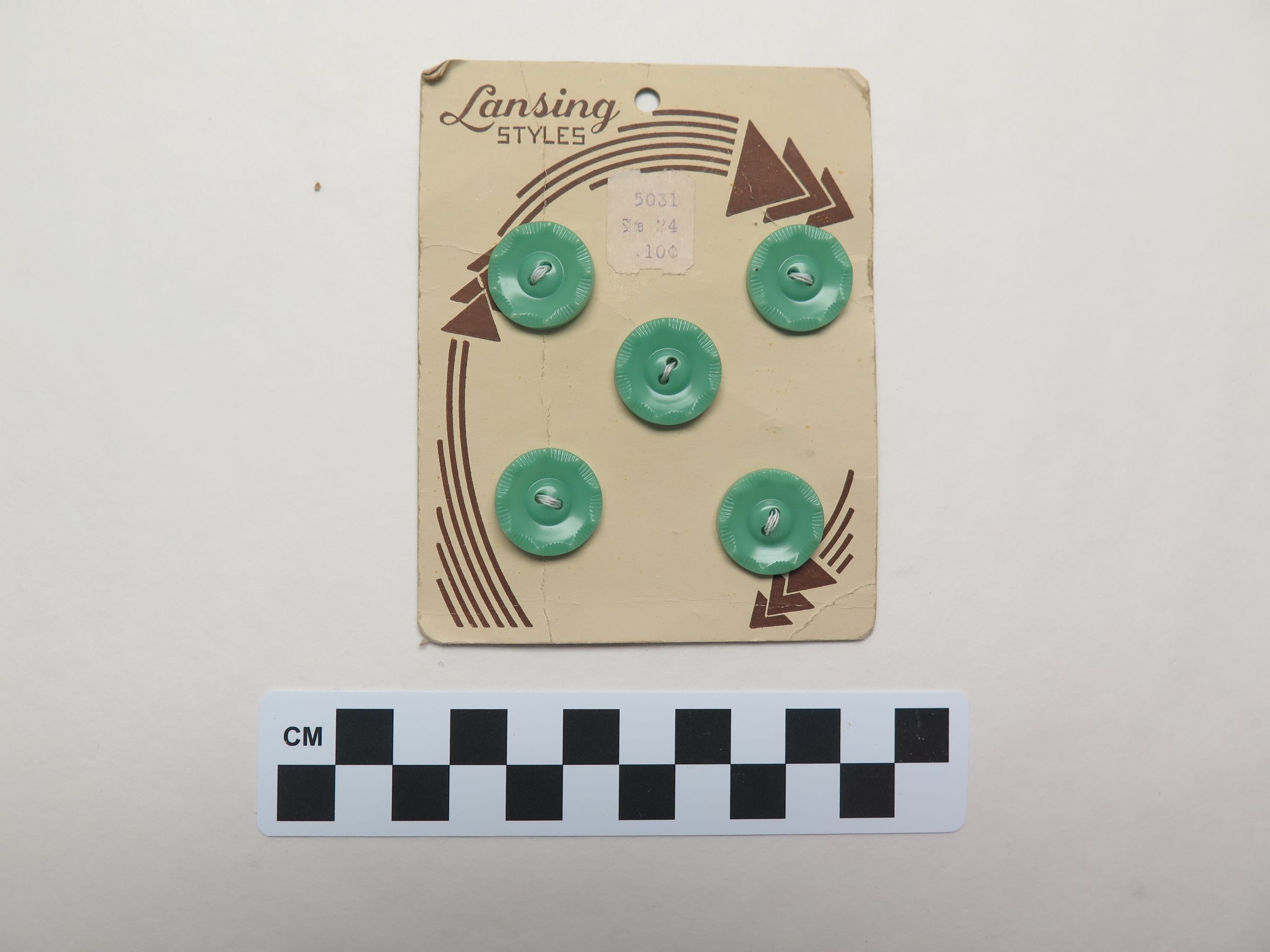 This is a set of 5 round green Lansing brand buttons on a card. The card measures 3.25" (w) x 4" (l).