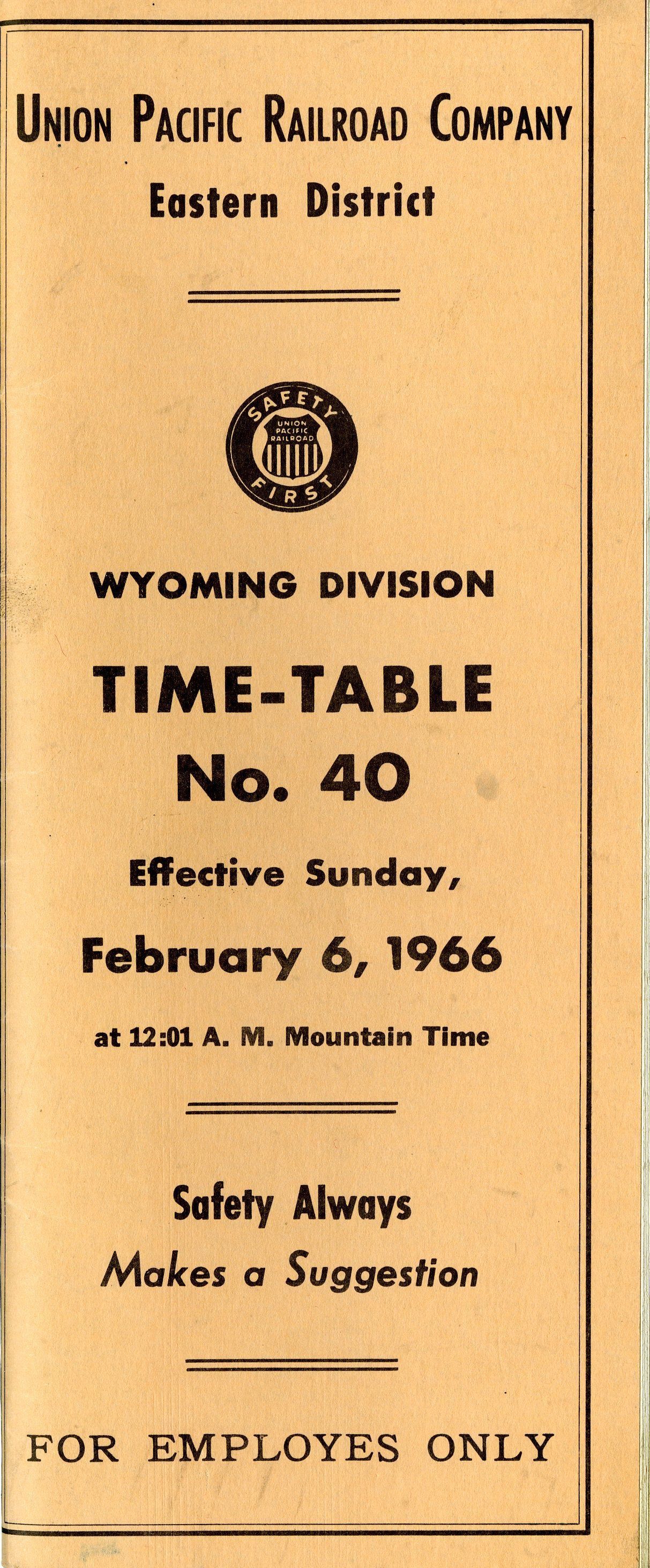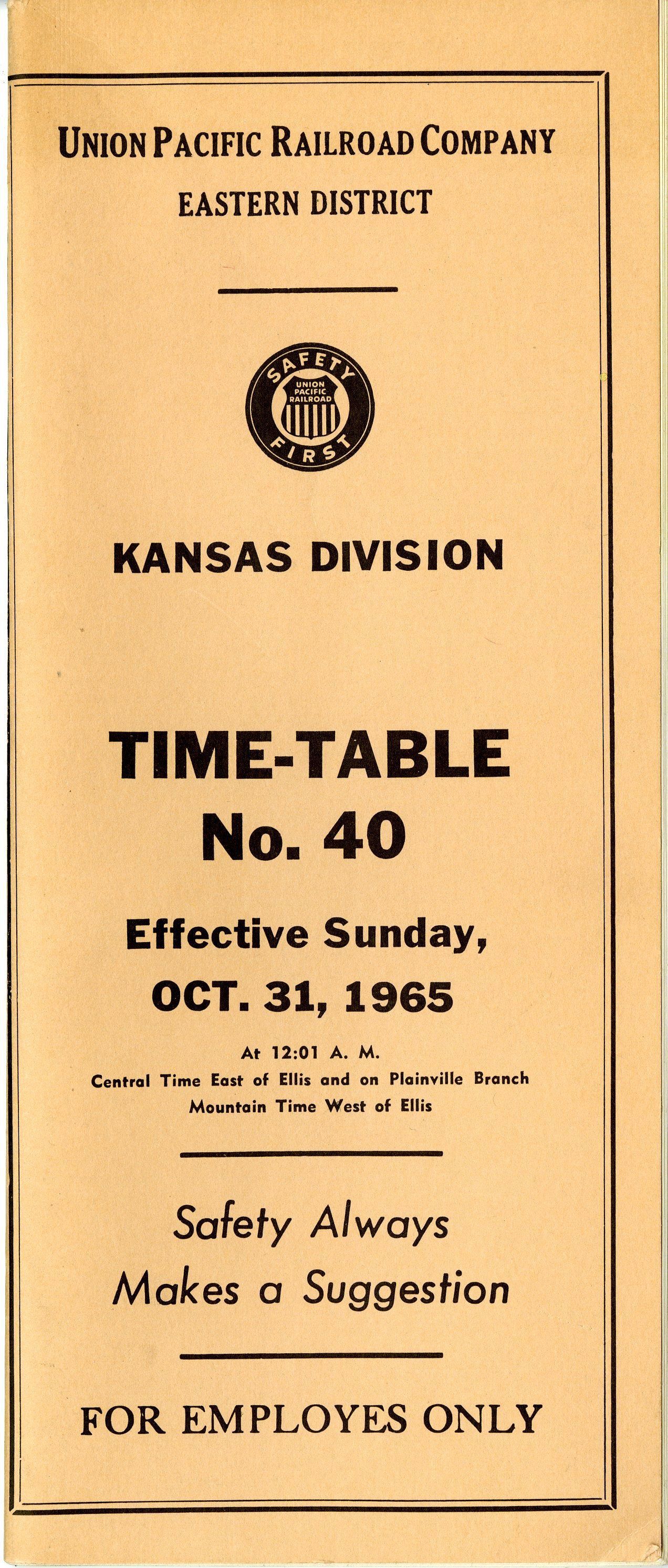 Three employee timetables for the Union Pacific Railroad, 1965-1966. Each timetable is 4" x 10" when folded, cream colored. All timetables represent the Eastern Division of the company, and are titled "Time-Table No. 40." The Union Pacific logo, within a seal that states "Safety First," is on the front of each. Captions near the bottom of the timetables reads, "Safety Always Makes a Suggestion" and "For Employes Only." Two of the timetables are for the Kansas Division, effective October 31, 1965. The third timetable is for the Wyoming Division, effective February 6, 1966.