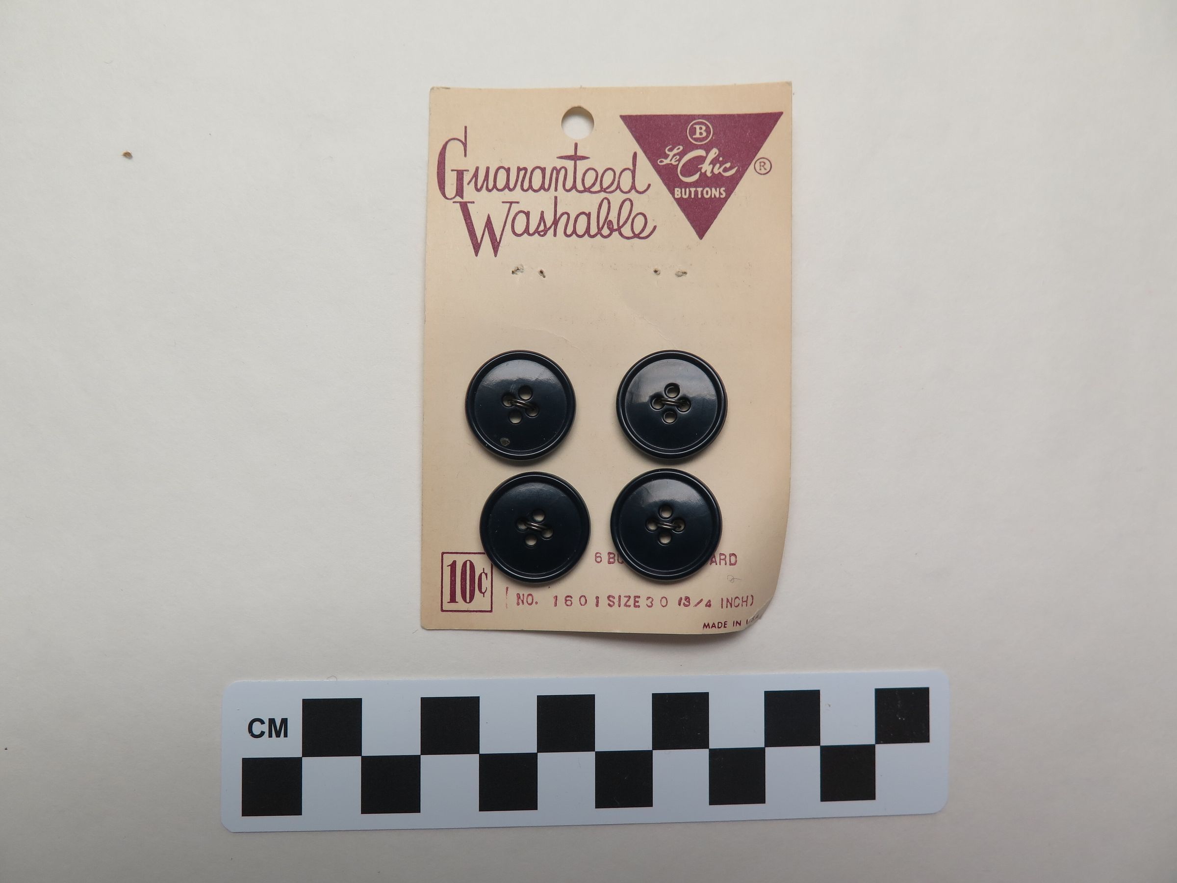 This is a set of 4 round, black, Le Chic brand buttons on a card. The card measures 2.5" (w) x 4" (l).