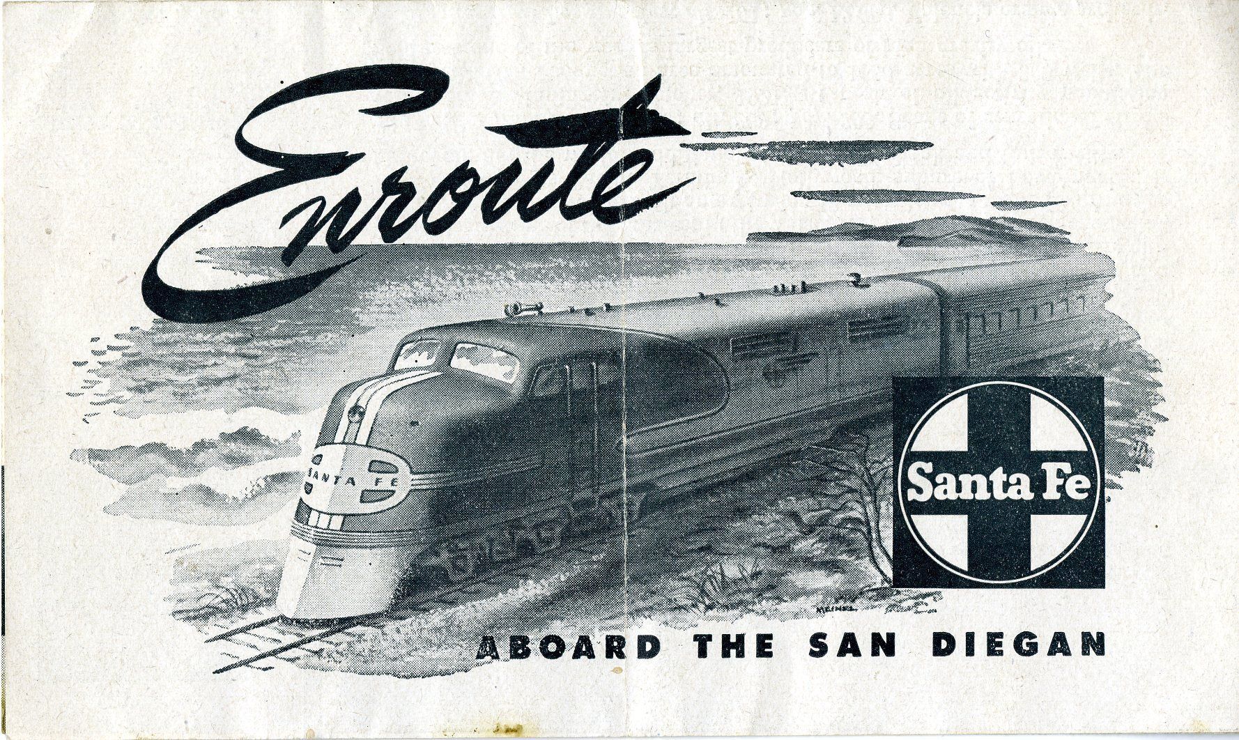 A small brochure train route guide printed by the Atchison, Topeka, and Santa Fe Railway Company, titled "Enroute Aboard the San Diegan," circa 1950. The guide is 3.5" x 6" when folded.6" x 10" unfolded. The front, when folded, has a pencil illustration of a Santa Fe train going through a desert/flat landscape, with the Santa Fe cross logo near the lower right corner.