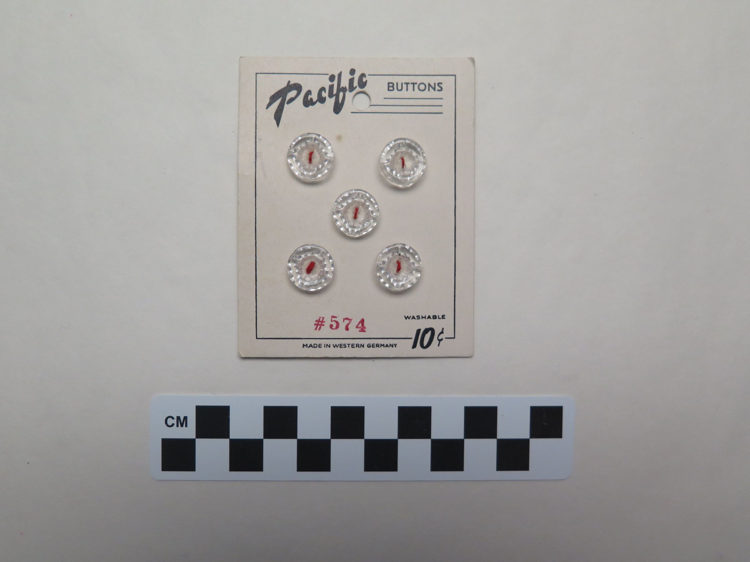This is a set of 5 clear, round, Pacific brand buttons on a card. The card measures 2.5" (w) x 3.5" (l).