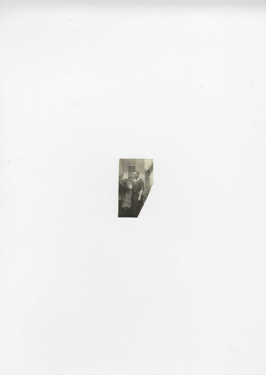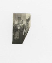 Photograph, Black and white, woman in dark dress and pearl necklace standing outside a house with plants.