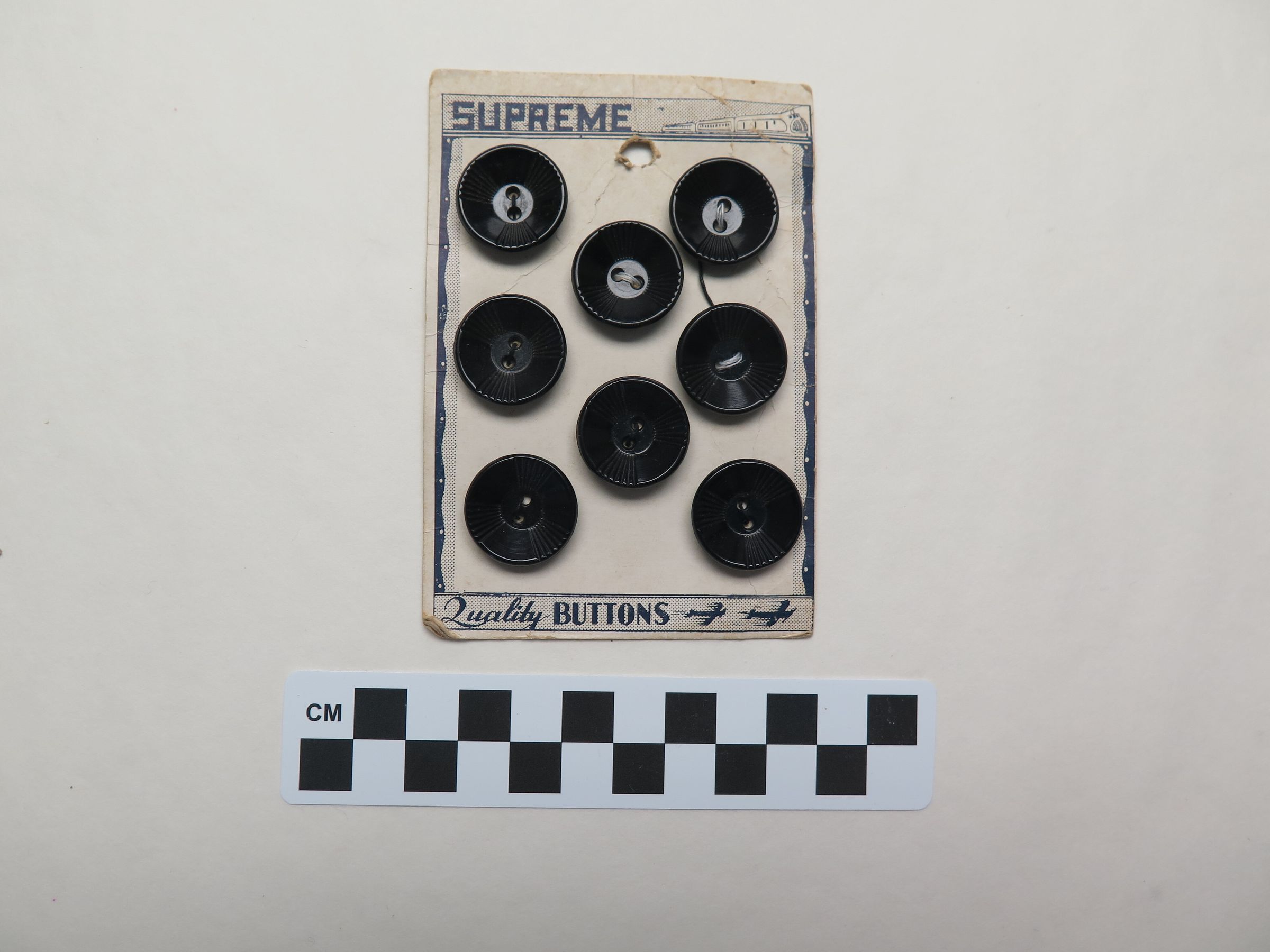 This is a set of 8 black Supreme Quality brand patterned buttons on a card. The card measures 3" (w) x 4.5" (l).