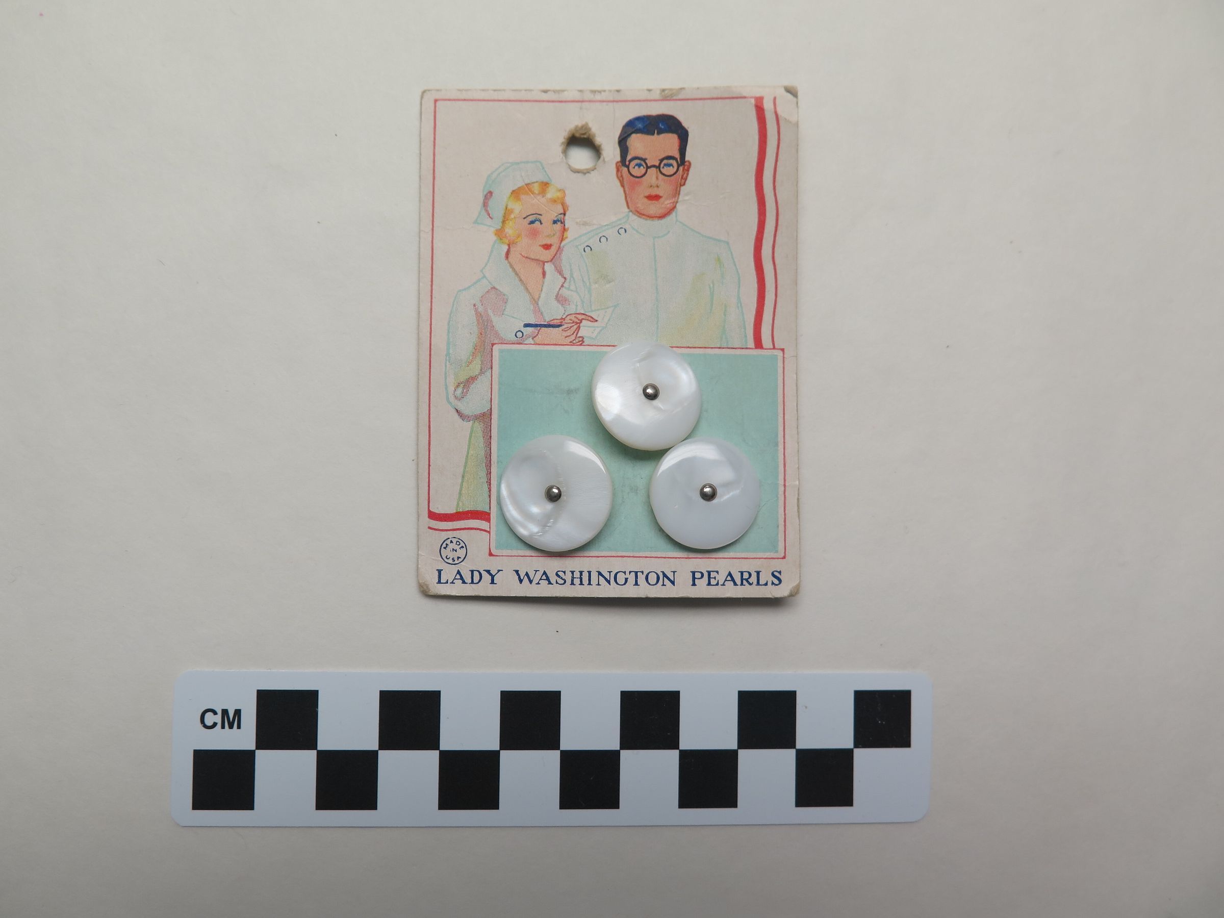 This is a set of 3 round, white, Lady Washington brand buttons on a card. The buttons are for doctor and nurse uniforms. The card measures 2.5" (w) x 3.5" (l).