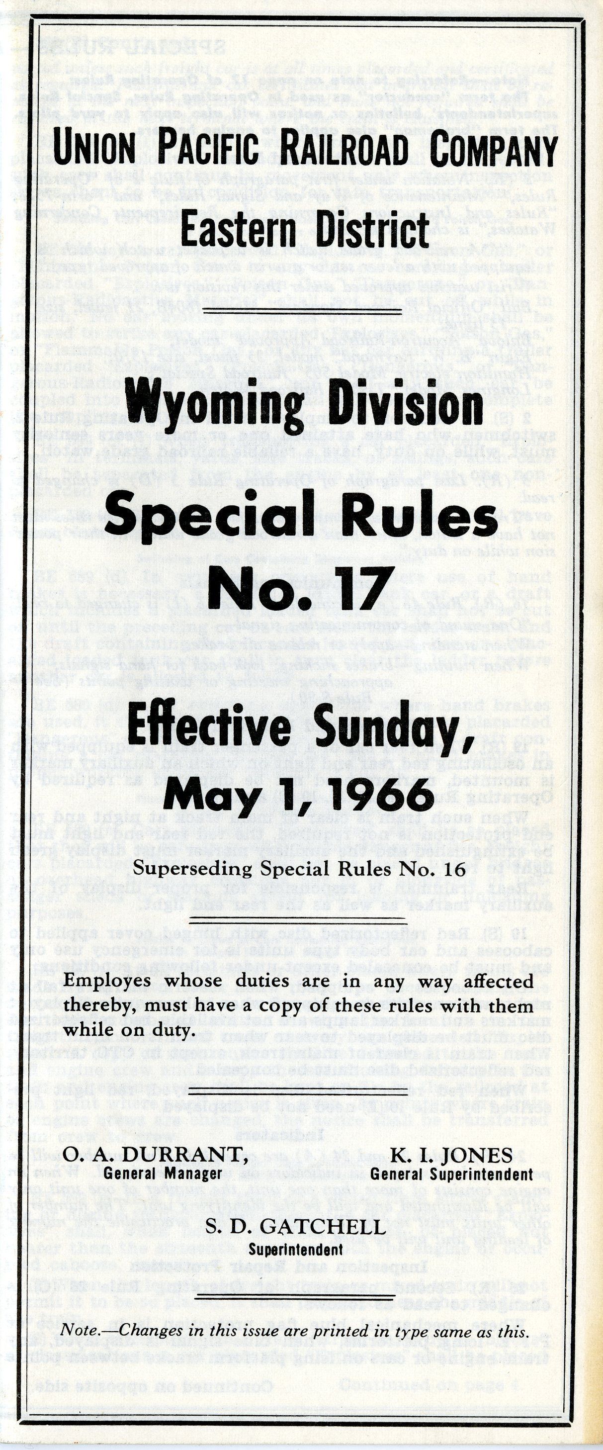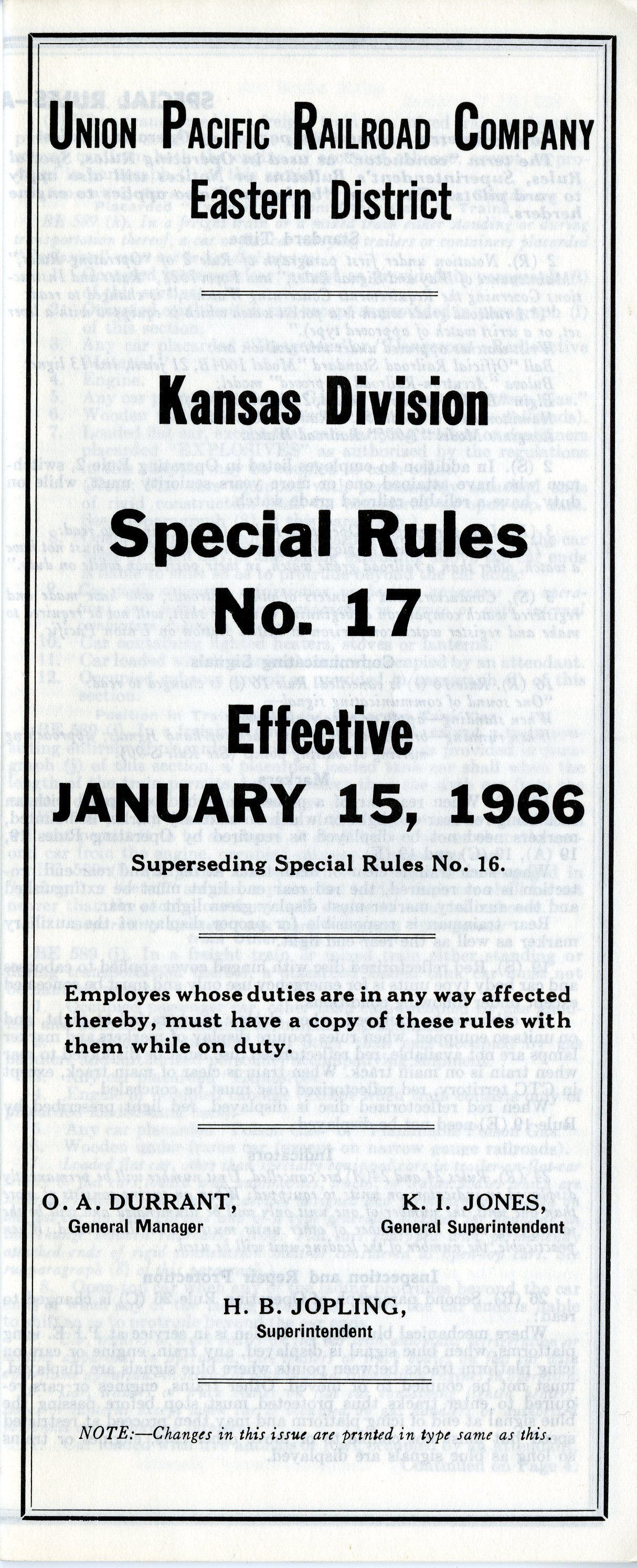 Three pamphlets of special rules for the Union Pacific Railroad Company Eastern District, 1966. Two of the pamphlets were effective January 15, 1966 and represented the company's Kansas Division; the other was effective May 1, 1966 and represented the Wyoming Division. Each pamphlet is 4" x 10," paper, with staples.