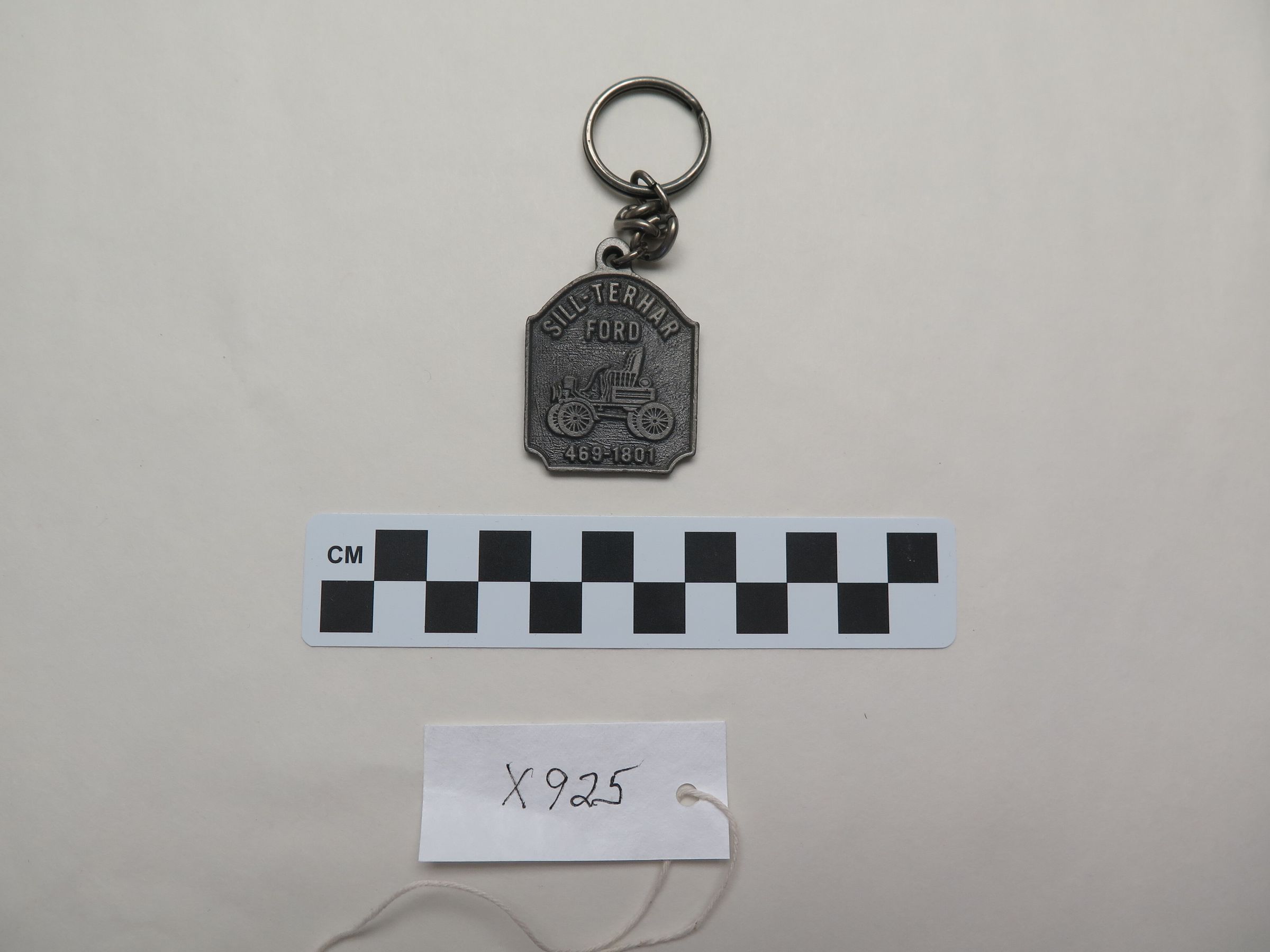 This is a metal key chain. The front of the key chain has the image of a car and the text "SILL-TERHAR FORD" on it. The key chain measures 1.5" (w) x 4" (l).