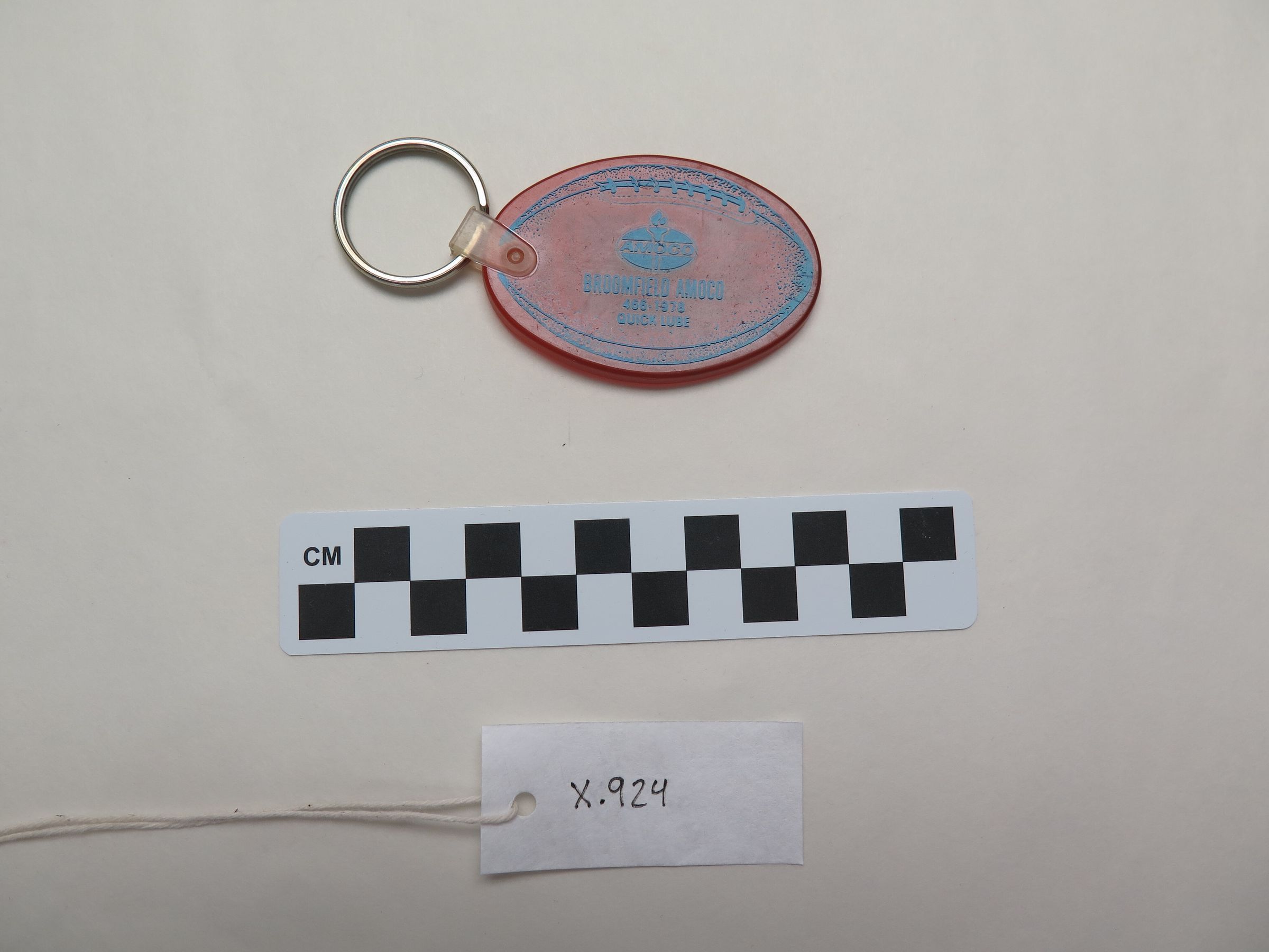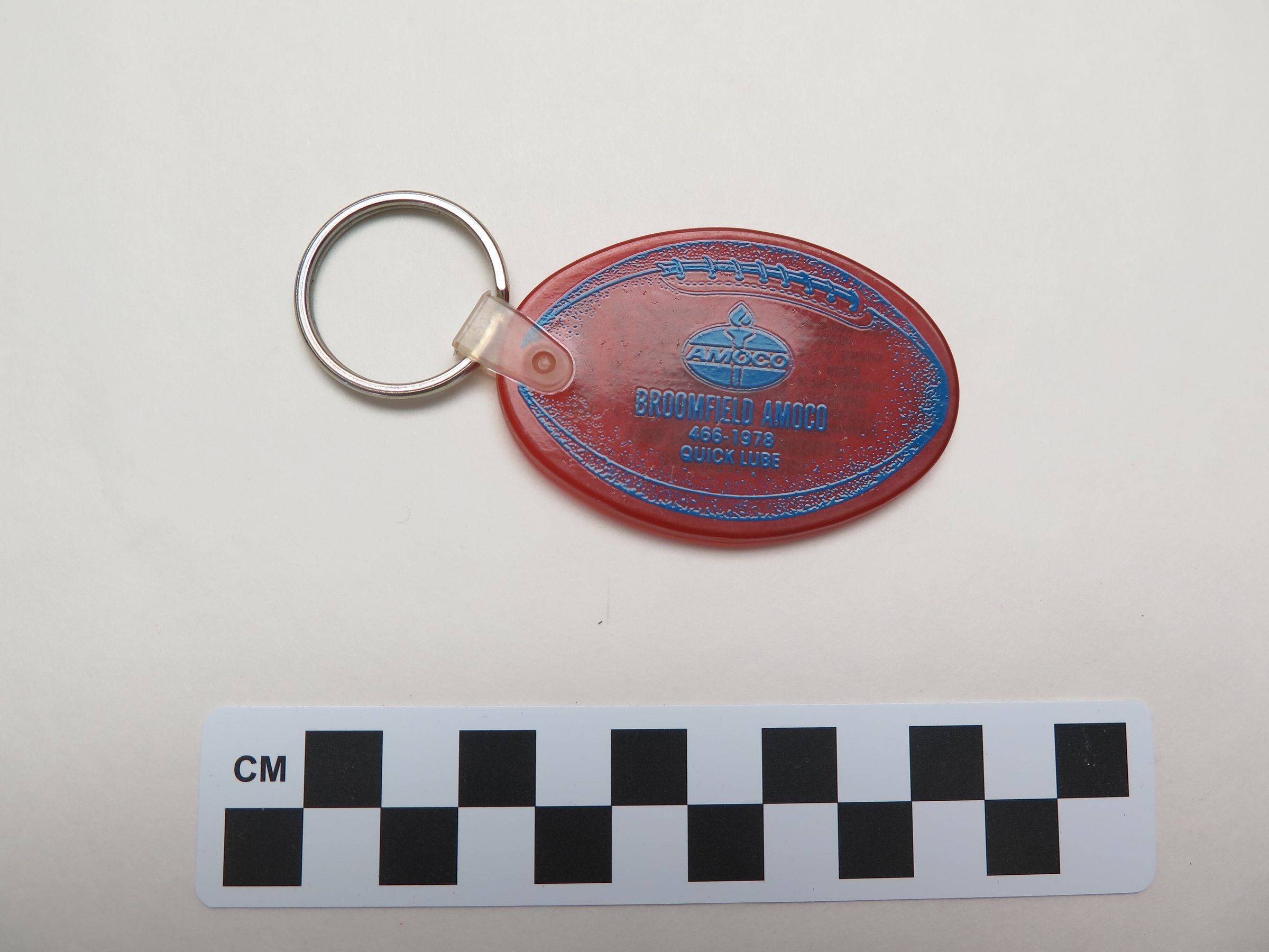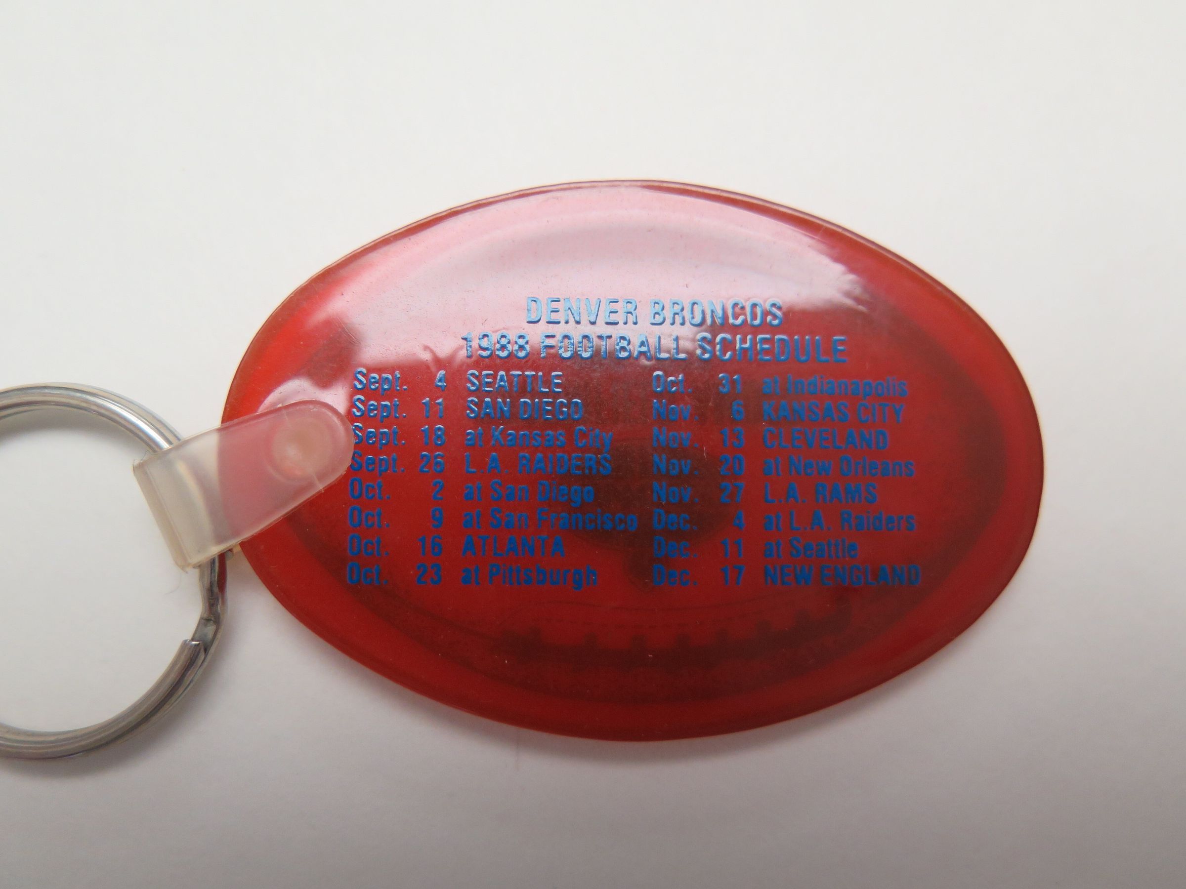 This is a red key chain from Broomfield AMCO. On the back of the key chain is the 1988 Broncos game schedule. The key chain measures 3.5" (w) x 1.75" (l).