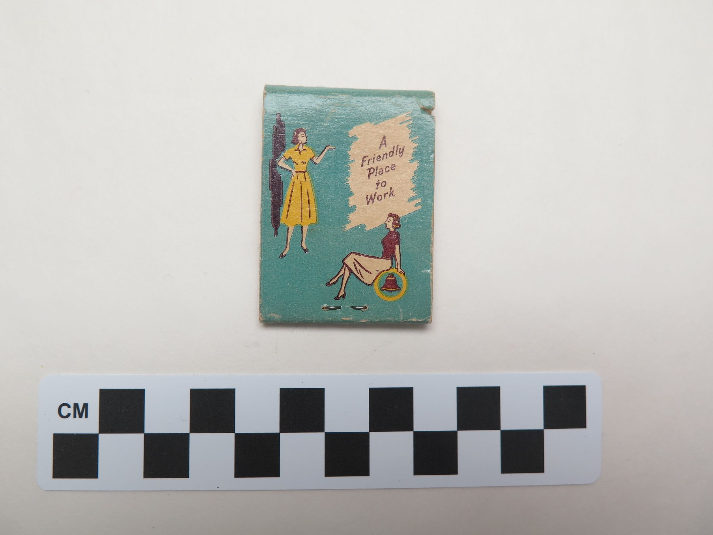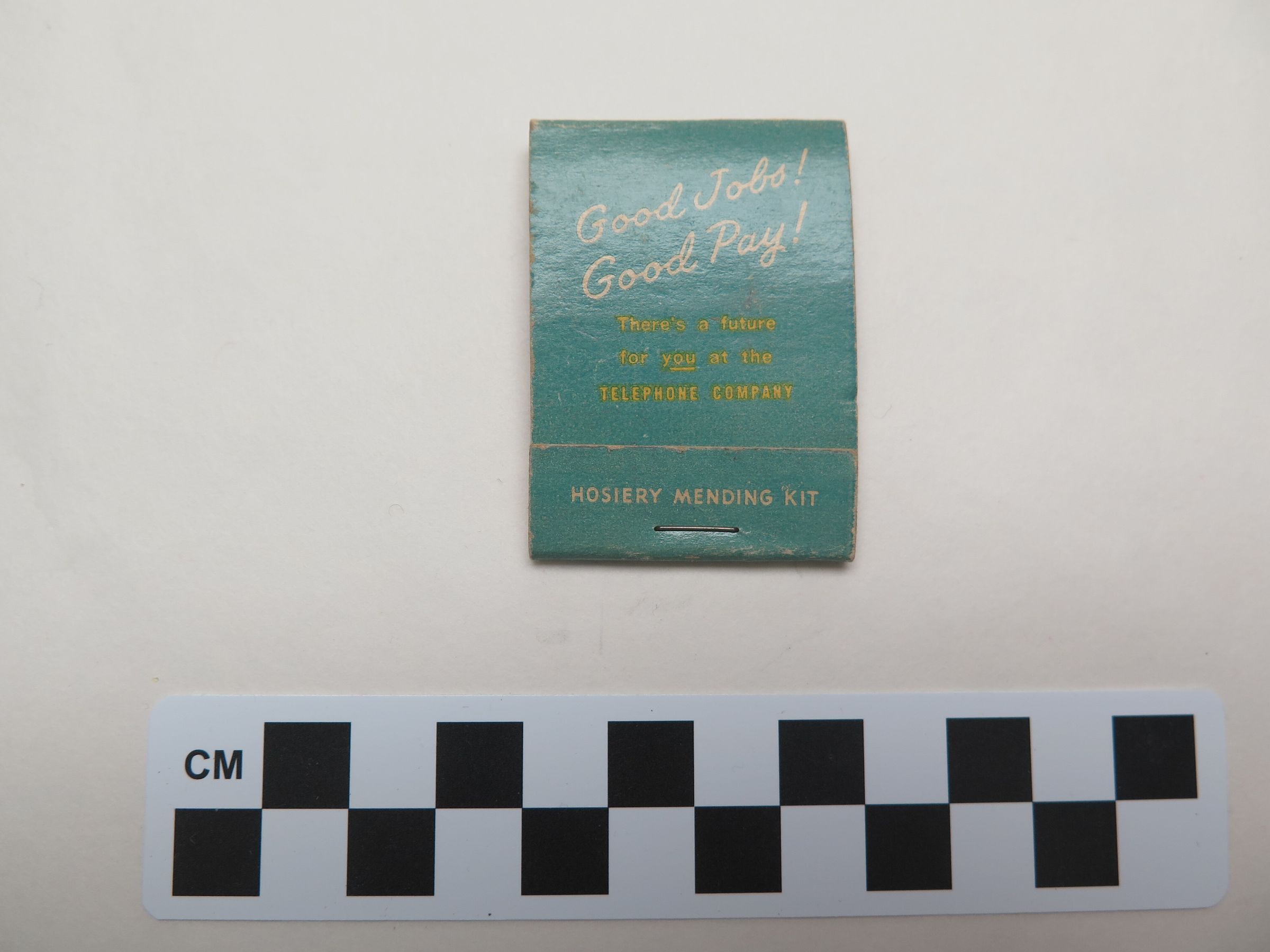 This is a hosiery mending kit. The kit has text on the front that reads, "A friendly place to work" and text on the back that reads, "Good work! Good pay!" The kit measures 1.5" (w) x 2" (l).