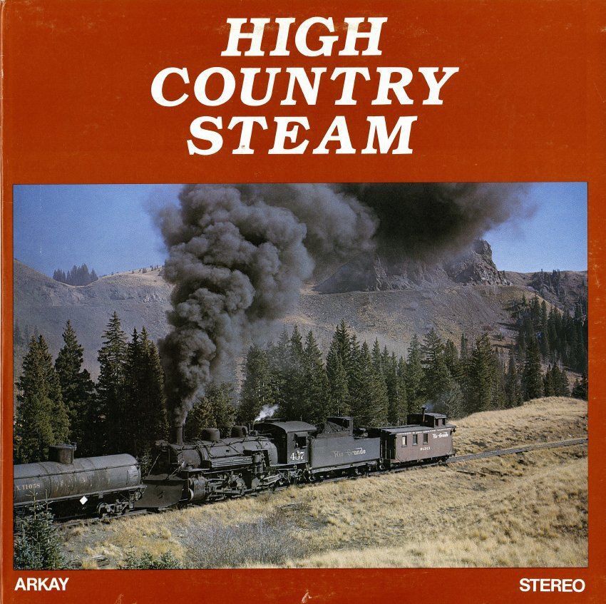 33 1/3 Audio record of train sounds, titled "High Country Steam," 1979. The record was published by Arkay Records. The jacket is 12" x 12" card board, with a photograph of a Denver and Rio Grande Western Railroad train on narrow gauge tracks in mountain scenery on the front. The reverse side has a line map for the trains recorded on the record going from Chama to Cumbres between New Mexico and Colorado; a brief history of the Denver and Rio Grande Western Railroad Narrow Gauge line; a description of the record's contents; and a list of different trains recorded on each side of the record. The back also has photograph images of various trains.