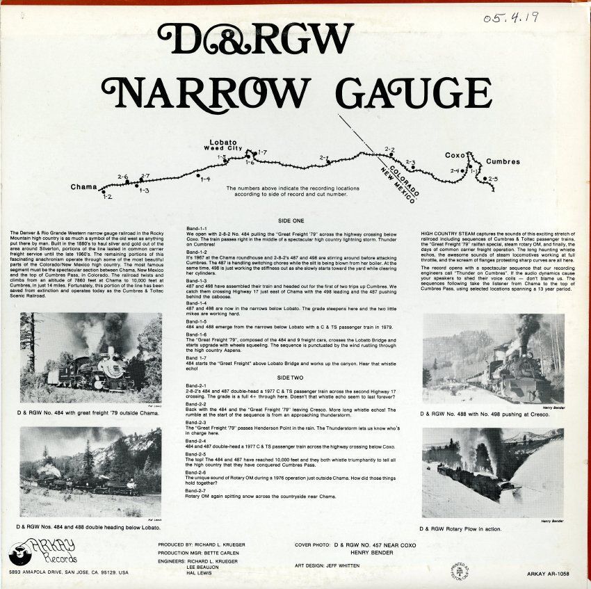 The record itself includes train sounds recorded from rail trips taken in the 1960s and 1970s. The trips were taken along the Denver and Rio Grande Railroad's narrow gauge line in the high country of New Mexico and Colorado, which was mostly used for mining, freight transportation, and some passenger service from the 1880s through the 1960s. The record jacket describes what the trips entailed. Some of the specific noises that can be heard include train whistles, running steam locomotives, and flanges turning corners. The total length is not specified.Collection