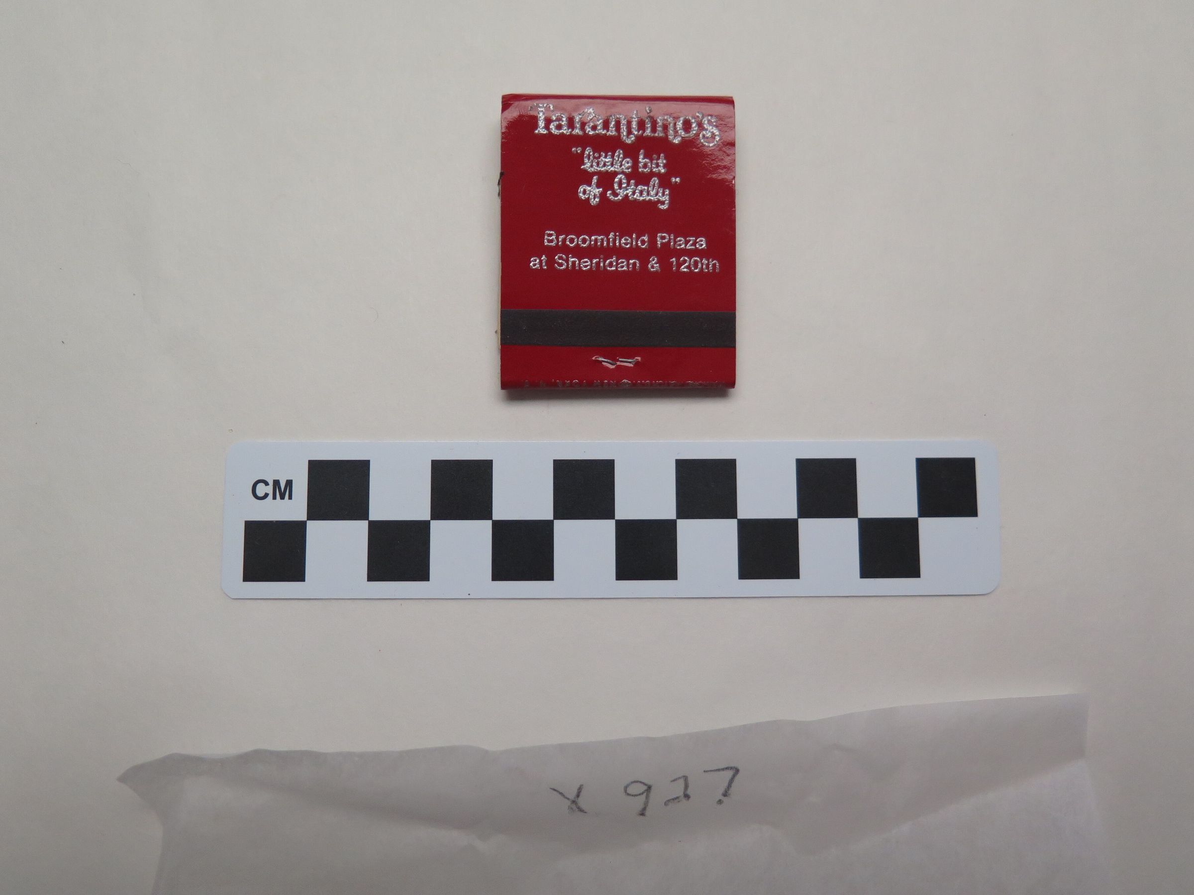This is a red matchbook given away from Tarantino's Italian Restaurant. The matchbook measures 1.5" (w) x 2" (l).