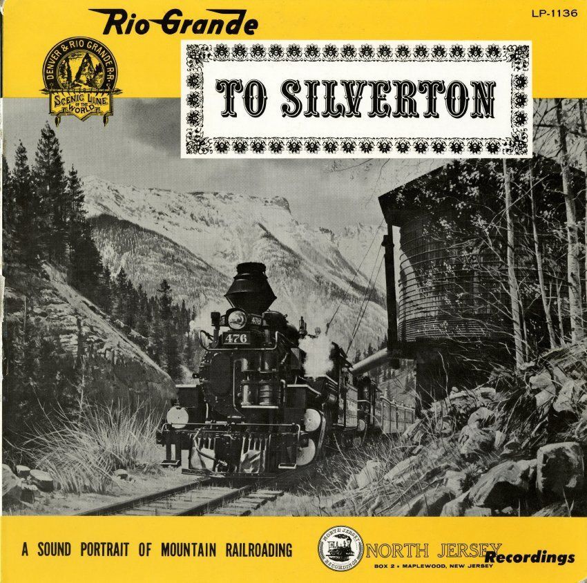 33 1/3 Audio record titled "Rio Grande to Silverton," containing train sound recordings, circa 1960. The record was published by North Jersey Recordings, Maplewood, New Jersey. Its LP number is LP-1136. The jacket is 12" x 12," card board, with a black and white illustration of a #476 Denver and Rio Grande Western Railroad train traveling on a narrow gauge line in a mountain landscape, with a water tower to its left. The caption, "A Sound Portrait of Mountain Railroading" is at the bottom. The reverse side of the jacket has a black and white photograph image of a narrow gauge train heading down tracks between mountainous terrain, with the caption "And Sounds of Narrow Gauge Freight in Action" at the bottom. The interior record sleeve has a reproduction of a 1907 Denver and Rio Grande timetable printed on it, made from the Robert W. Richardson Collection of the Colorado Railroad Museum. The jacket opens to reveal a background history of the Denver and Rio Grande Western Railroad, descriptions of the record contents, and record credits, along with photograph images of more trains.