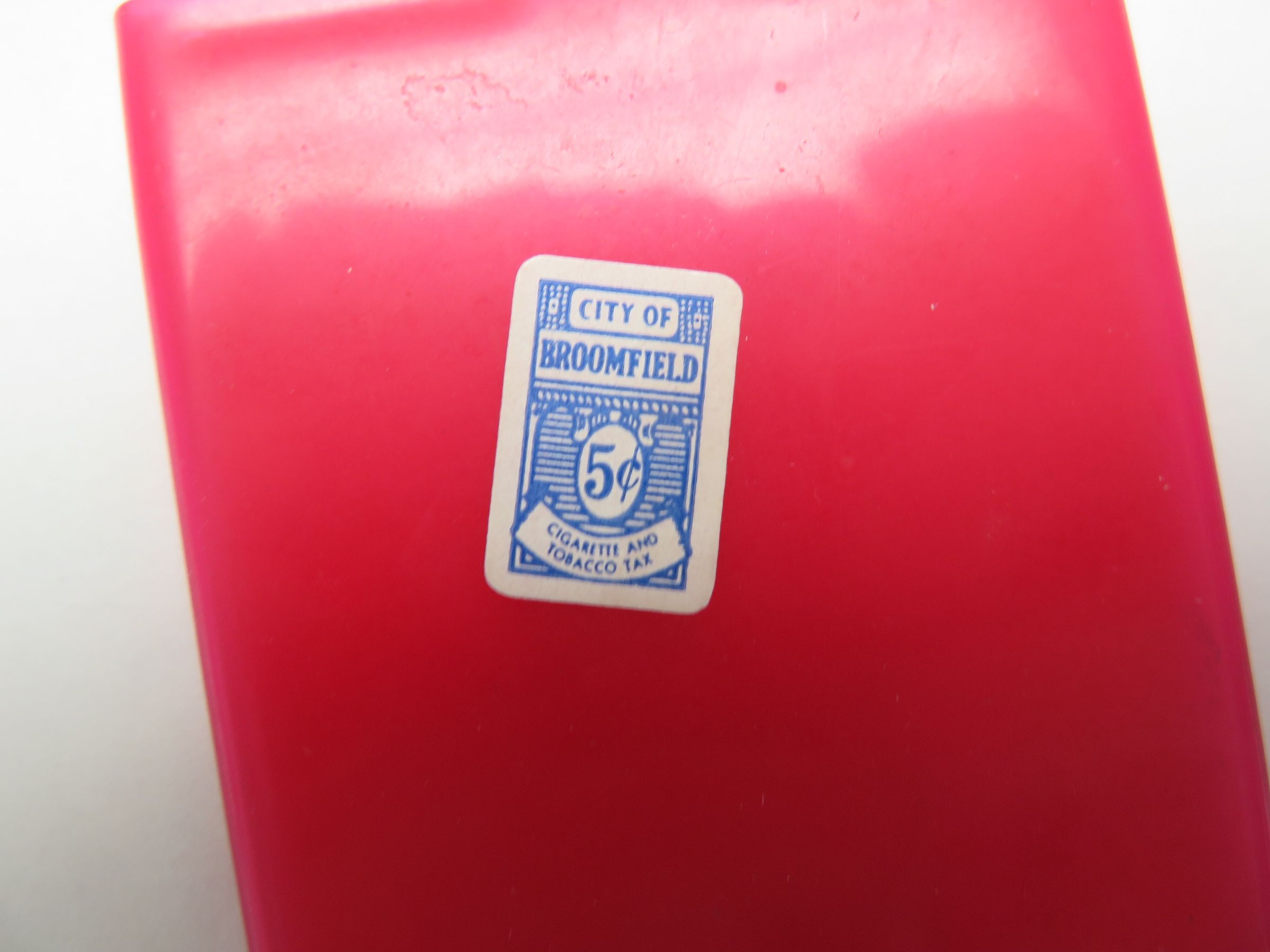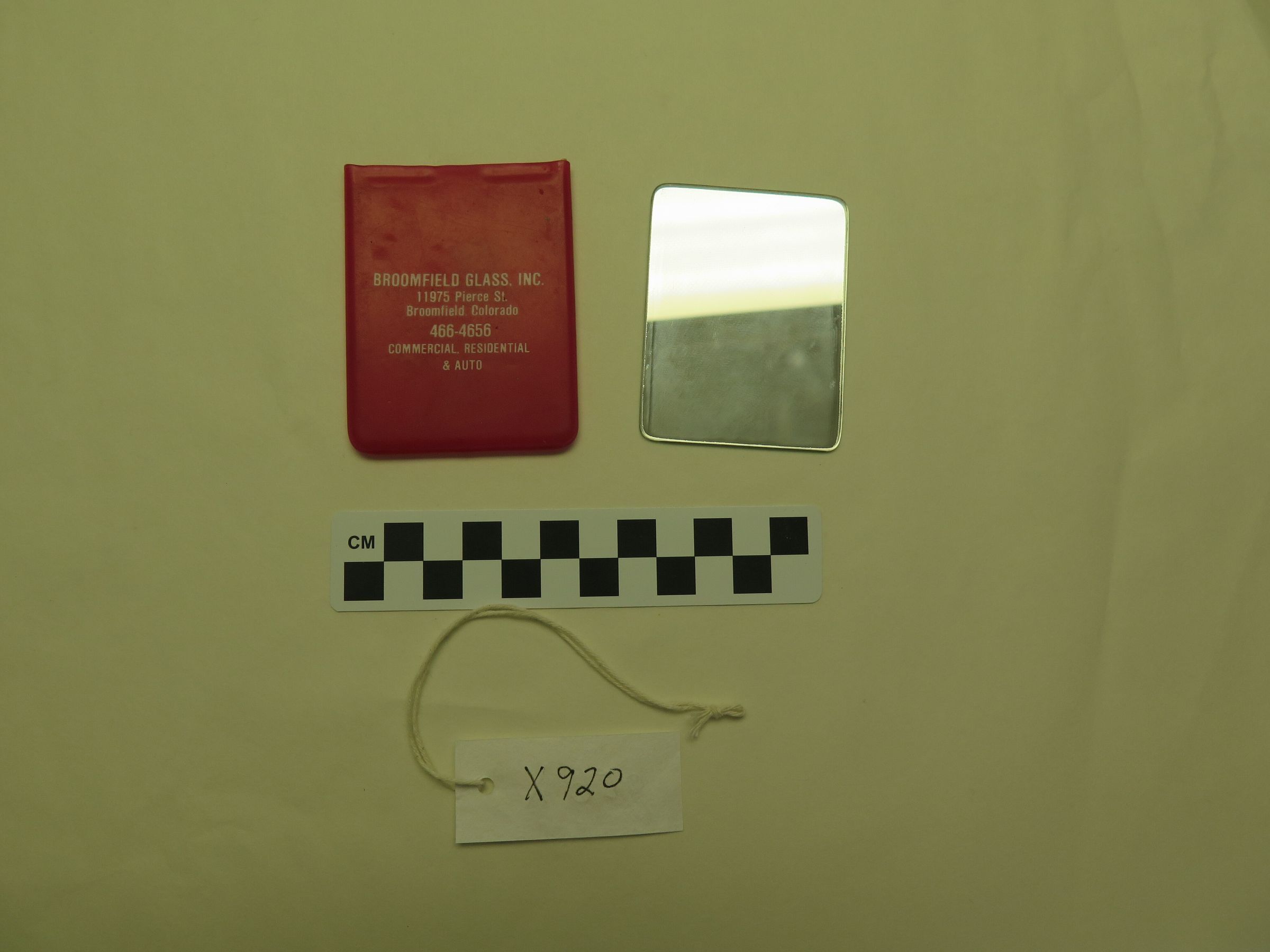 This is a mirror in a red case distributed as an advertisement of Broomfield Glass, Inc. The case measures 3" (w) x 2.25" (l).