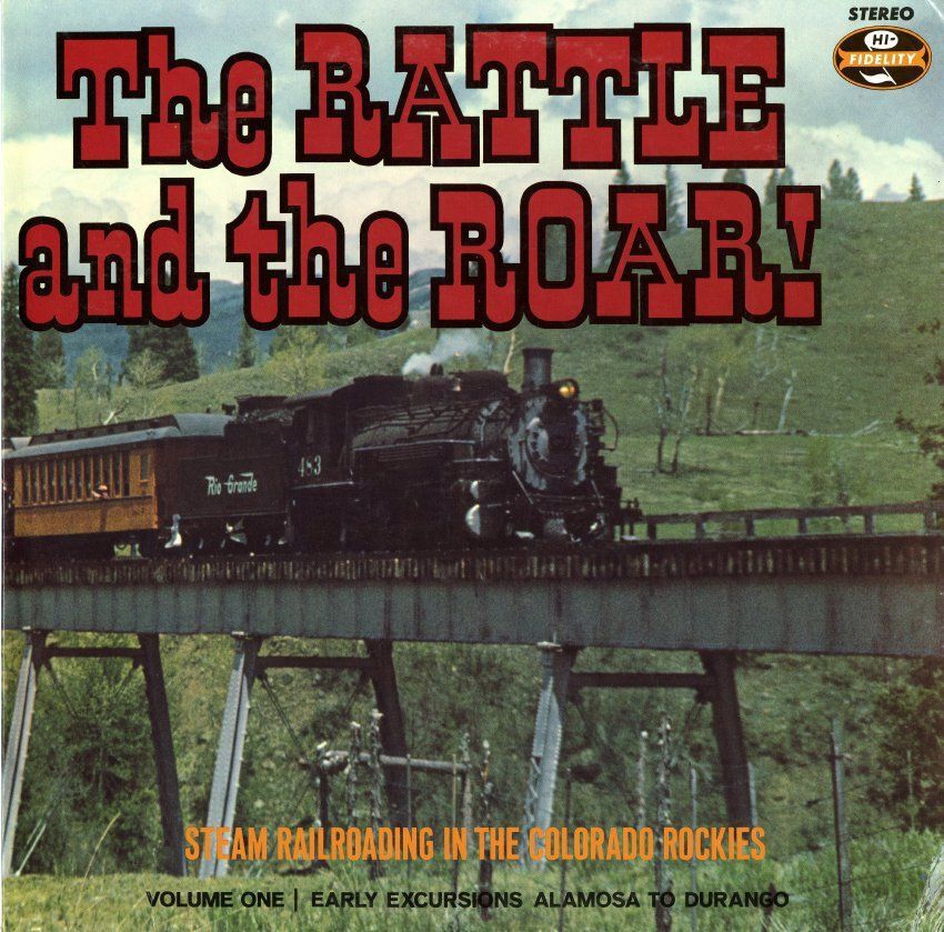 33 1/3 Audio record titled "The Rattle and the Roar: Volume 1, Early Excursions, Alamosa to Durango," containing train sounds, circa 1971. The record was published by Train Master Records, Manitou Springs, Colorado. The jacket is 12" x 12," with a color photograph image of a Denver and Rio Grande Western train going over a bridge in a mountainous landscape on the front. The caption "Steam Railroading in the Colorado Rockies" is at the bottom. The reverse side of the jacket has a description of the record contents, as well as a list of train recordings by side and cut. It also lists all volumes in the record series; the record is one of seven volumes.