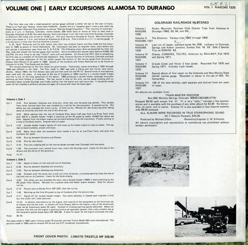 The record itself has recording from 1962 through 1965, consisting of train sounds from annual "Narrow Gauge Excursion" trips made by the Rocky Mountain Railroad Club at Denver and Rio Grande Western Railroad line sections between Durango and Alomosa, Colorado. Types of sounds recorded include train whistles, locomotive engine starting, engine signals, engine cooling with water, crossing warning signals, and others. The length is 25 minutes, 10 seconds.Collection