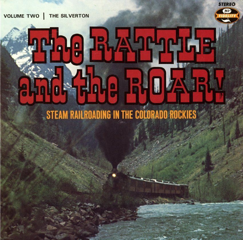 33 1/3 Audio record titled "The Rattle and the Roar: Volume 2, The Silverton," containing train sounds, circa 1971. The record was published by Train Master Records, Manitou Springs, Colorado. The jacket is 12" x 12," with a color photograph image of a Denver and Rio Grande Western train running by a river in a mountainous landscape on the front. The caption "Steam Railroading in the Colorado Rockies" is below the title. The reverse side of the jacket has a description of the record contents, as well as a list of train recordings by side and cut. It also lists all volumes in the record series; the record is one of seven volumes.