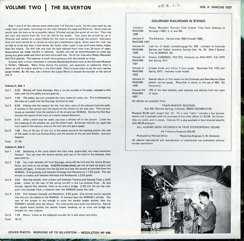 The record itself has recording from 1962 through 1965, consisting of train sounds from annual "Narrow Gauge Excursion" trips made by the Rocky Mountain Railroad Club at Denver and Rio Grande Western Railroad line sections between Durango and Alomosa, Colorado. It is a continuation of recordings on the previous record album, volume 1. Types of sounds recorded include train whistles, locomotive engine starting, running water of rivers, telegraph typing, and others. The length is 18 minutes, 12 seconds.Collection