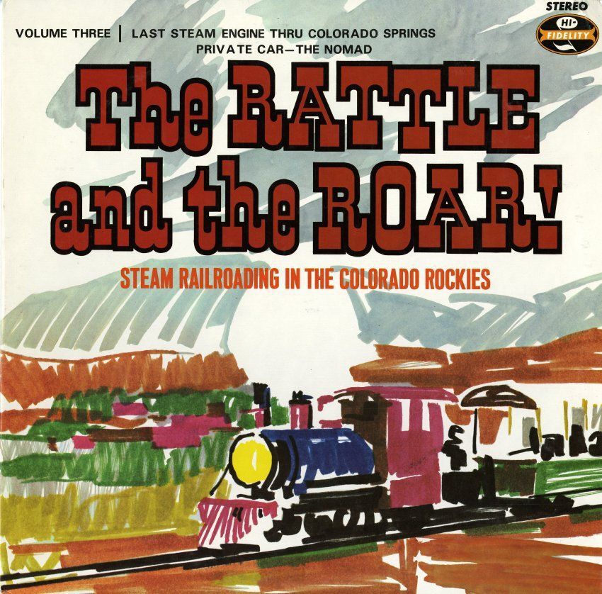 33 1/3 Audio record titled "The Rattle and the Roar: Volume 3, Last Steam Engine Thru Colorado Springs, Private Car - The NOMAD," containing train sounds, circa 1971. The record was published by Train Master Records, Manitou Springs, Colorado. The jacket is 12" x 12," with a color marker illustration image of a train running through a mountain landscape on the front. The caption "Steam Railroading in the Colorado Rockies" is below the title. The reverse side of the jacket has a description of the record contents, as well as a list of train recordings by side and cut. It also lists all volumes in the record series; the record is one of seven volumes.