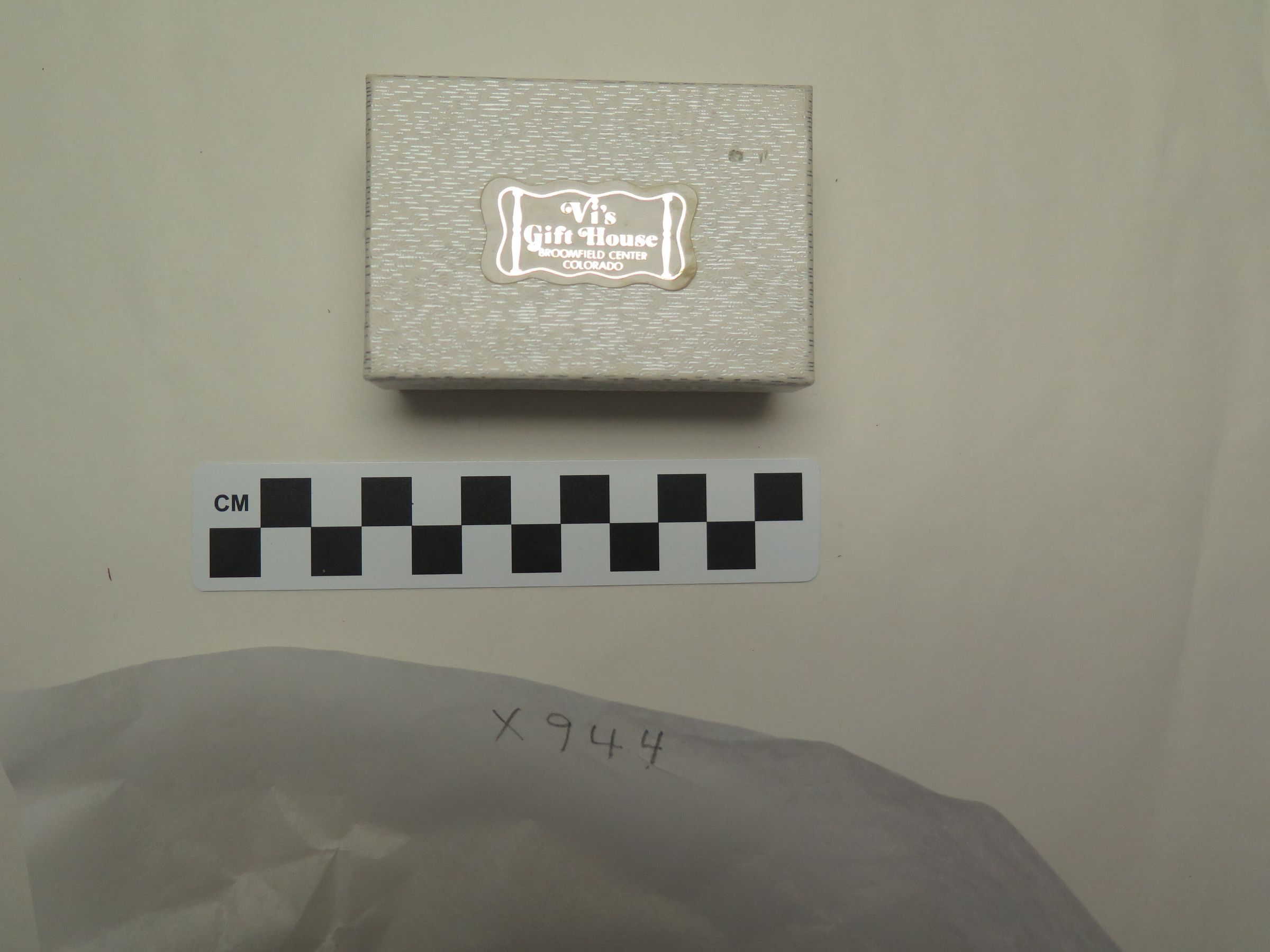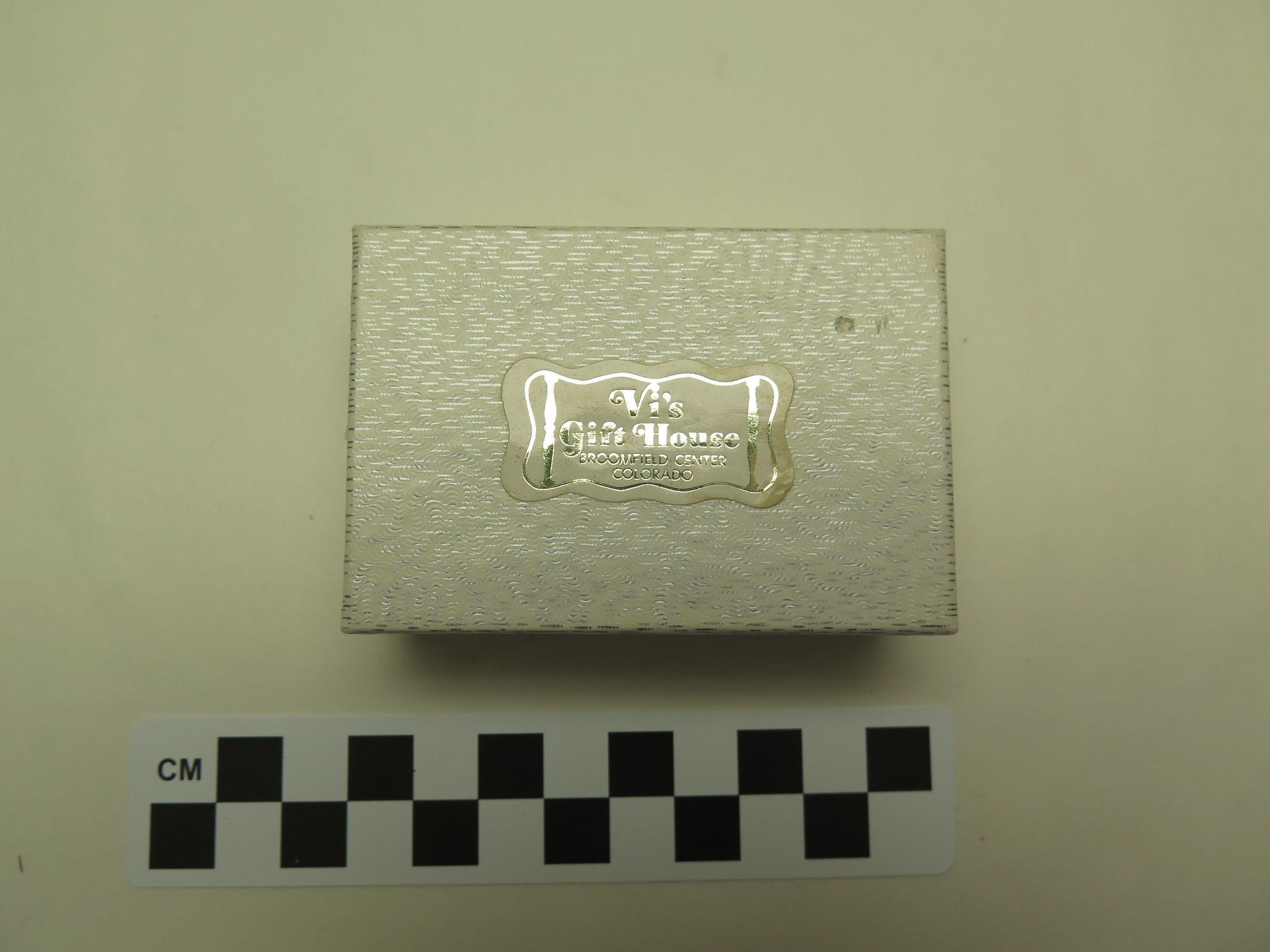 This is a white cardboard box with a lid. The box is from Vi's Gift House in Broomfield. The box measures 1" (h) x 3" (w) x 2" (l).