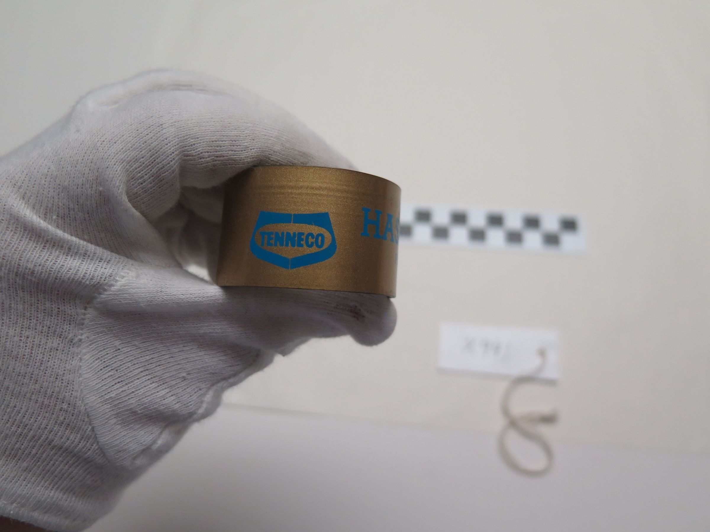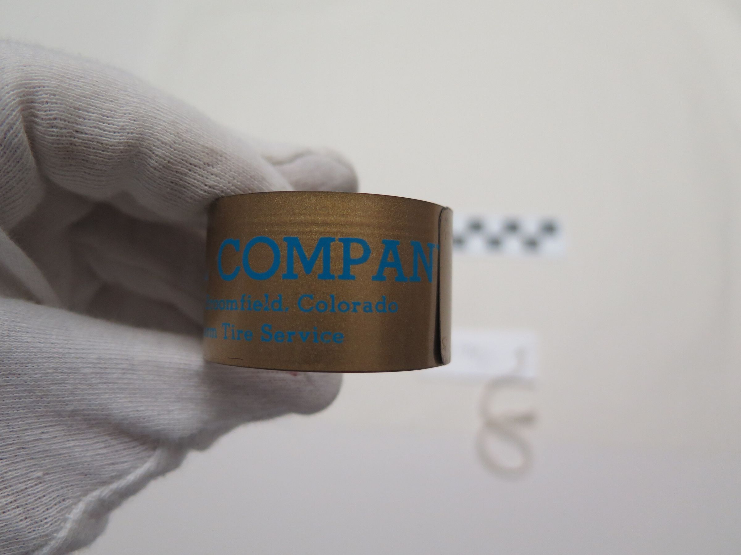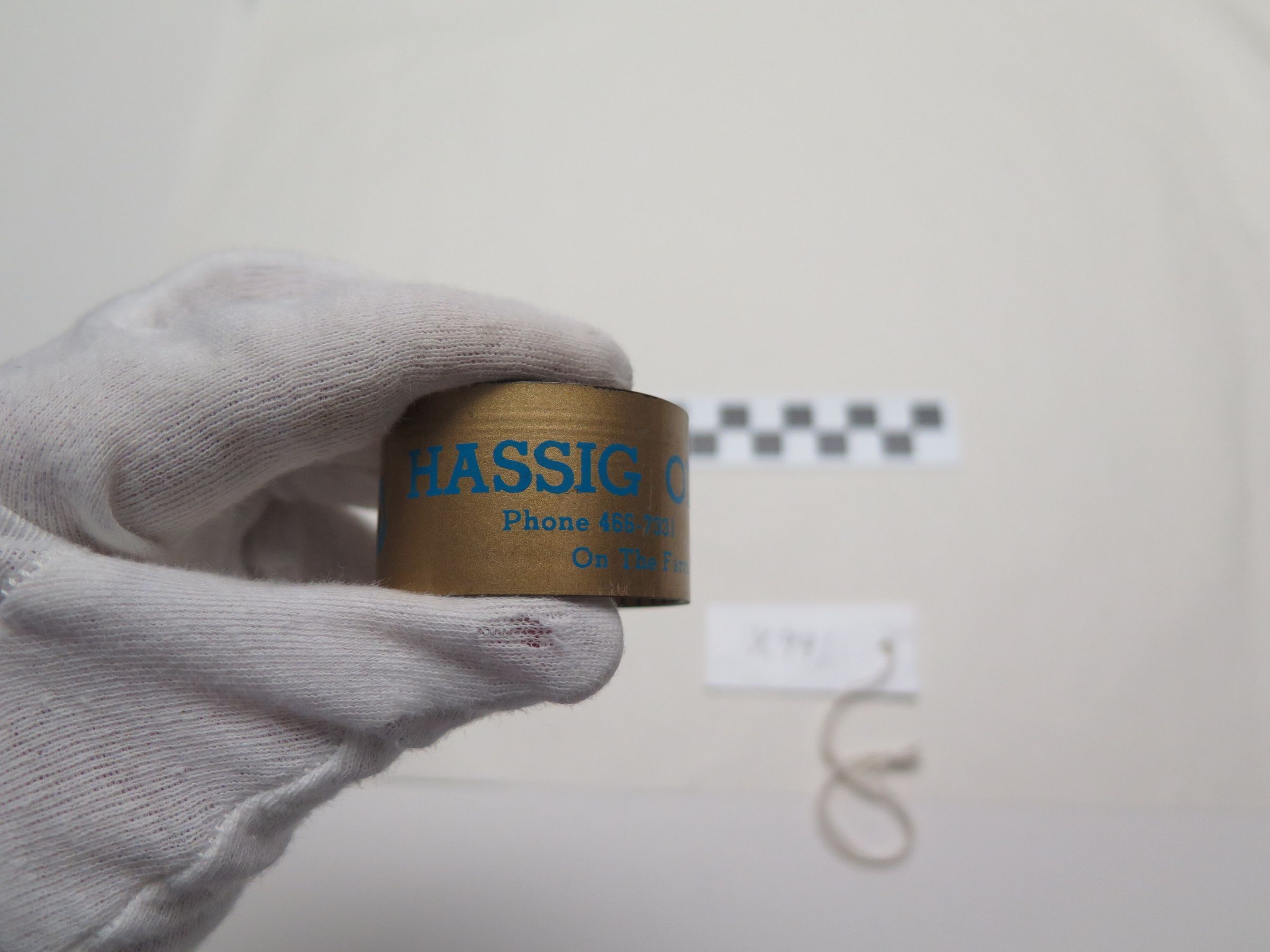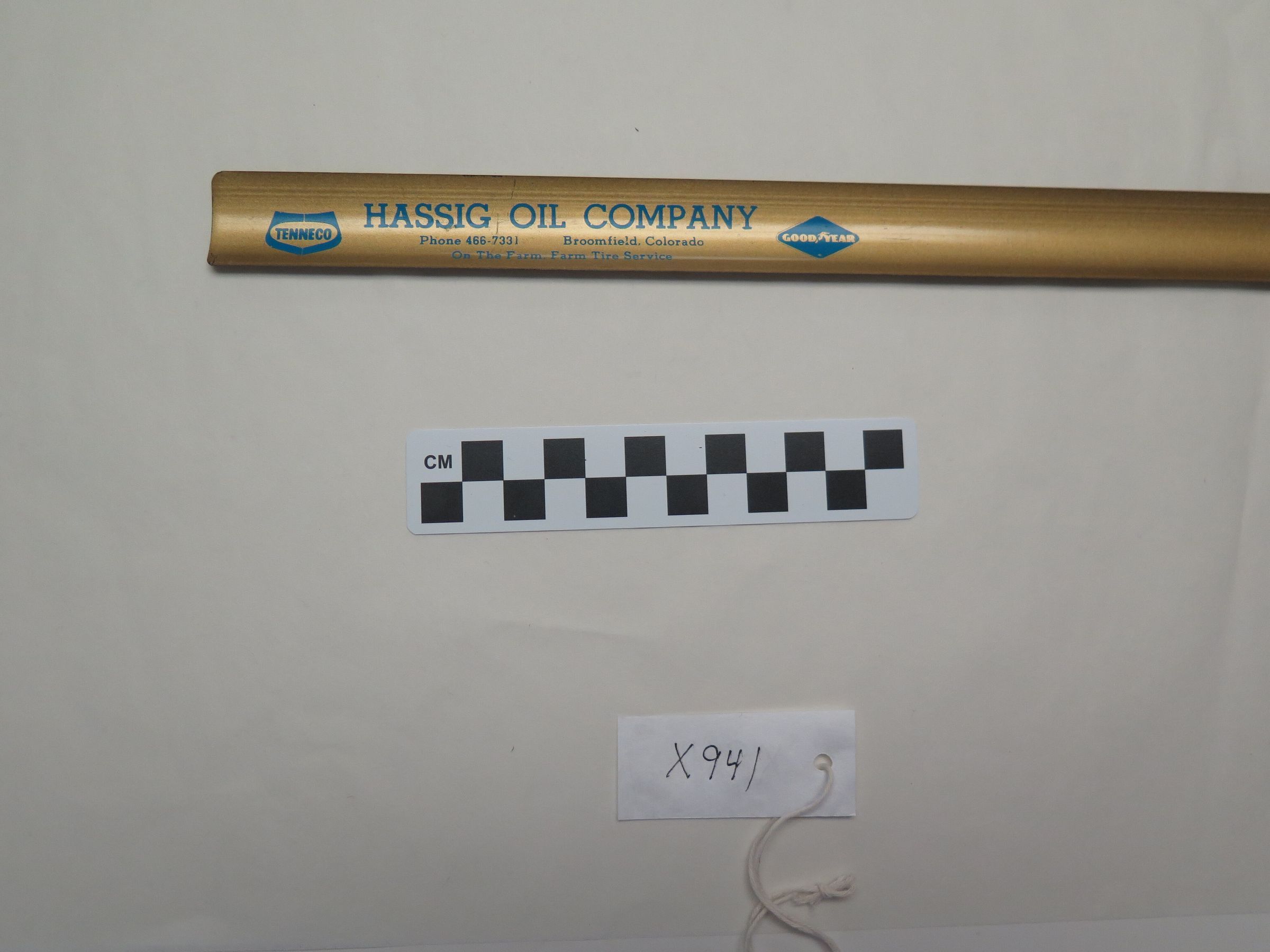 This is a 36" (l) metal measuring tape that rolls up. The measuring tape was an advertisement for Hassig Oil Company. The measuring tape measures 1" (h) x 1.75" (dia) when rolled.