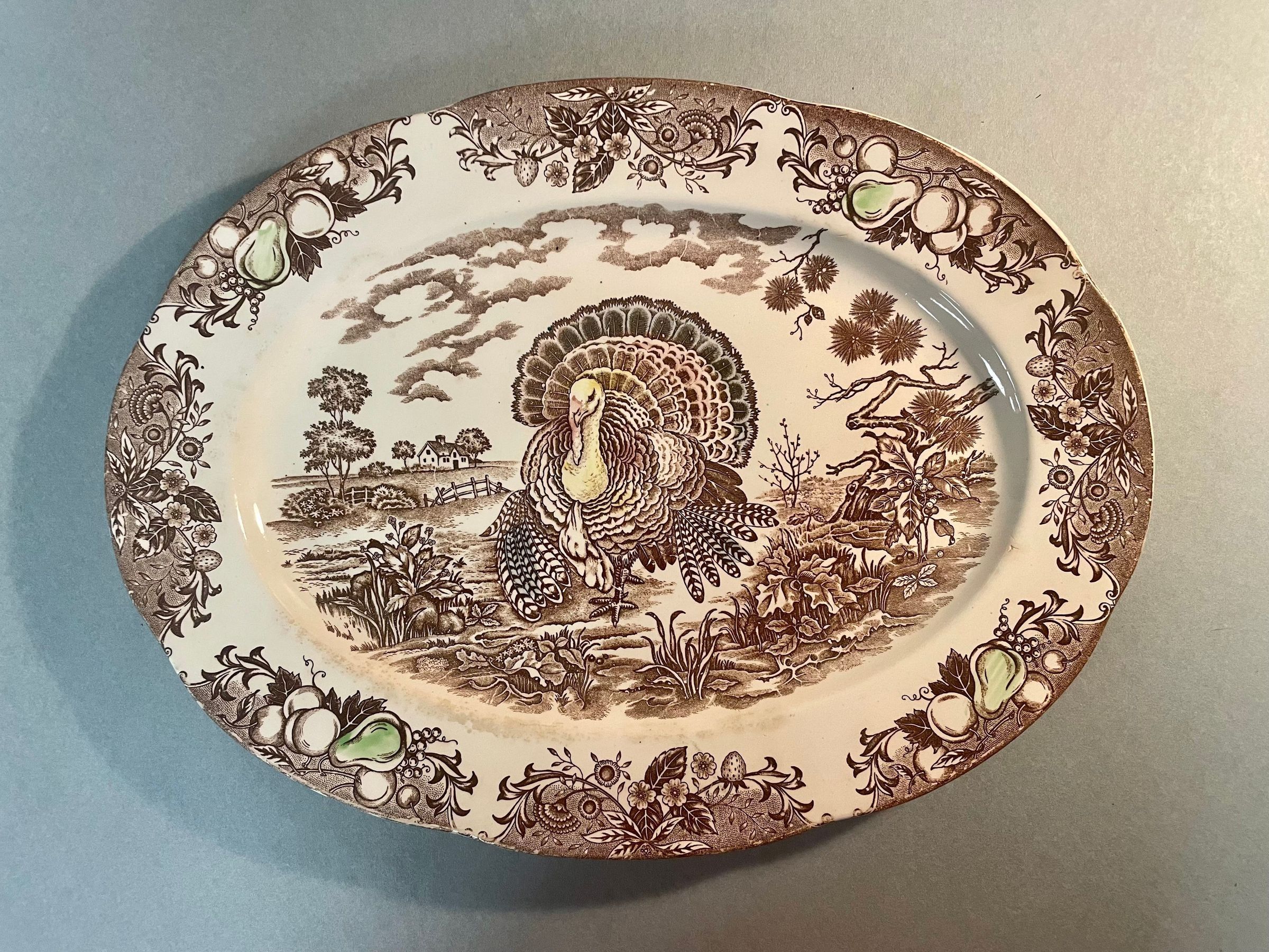 A 1960s oval-shaped, transferware turkey platter with hand-painted colored accents, made in Japan. Features a turkey in the center of the plate, standing on farmland, with a farmhouse, fences, and trees in the background. Border of the plate features decorative leaves, pears, and other fruit. Purchased by Kathy Hobaugh and her siblings (Randy, Rick, and Kelly) from the Broomfield Heights Ben Franklin variety store as a birthday gift for their mother, Iris June Chestnut. Used by Iris June Chestnut for over 50 years as a platter for Thanksgiving dinner.Inscription/Signature/Marks