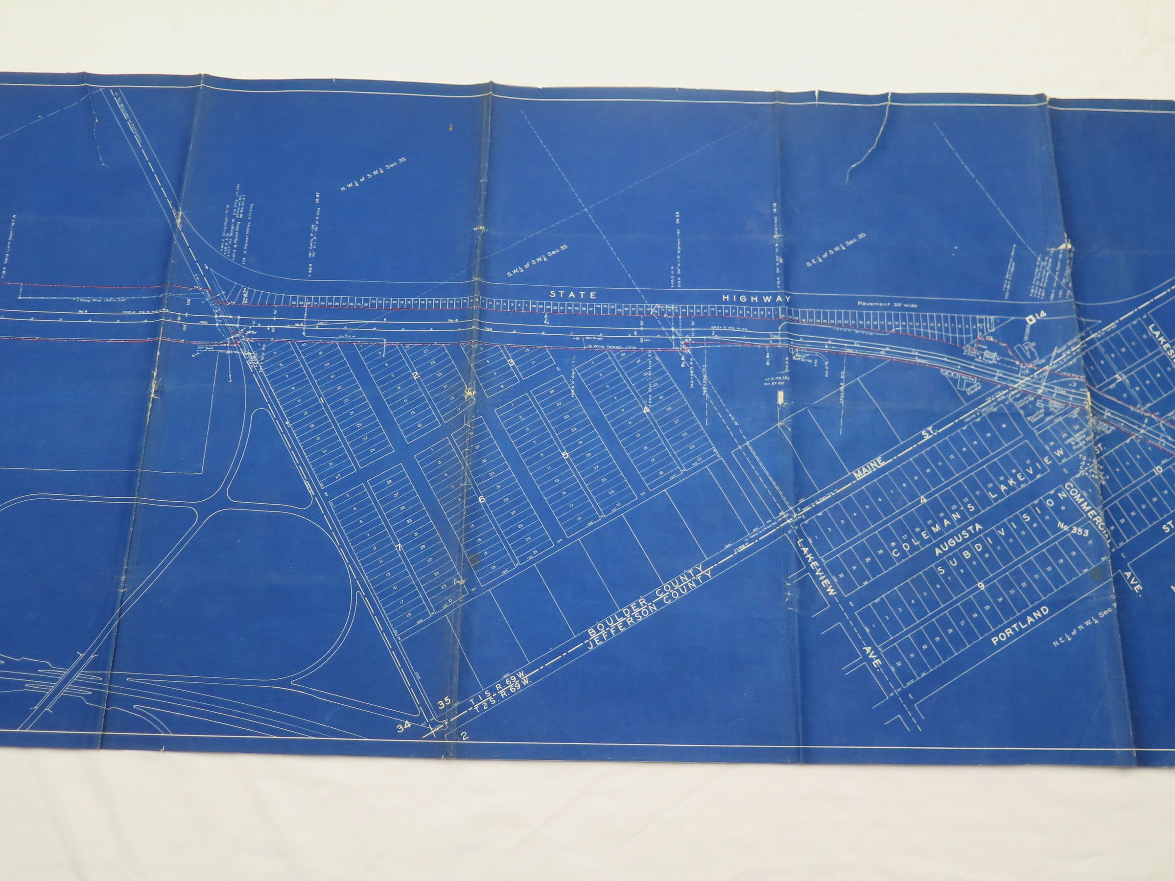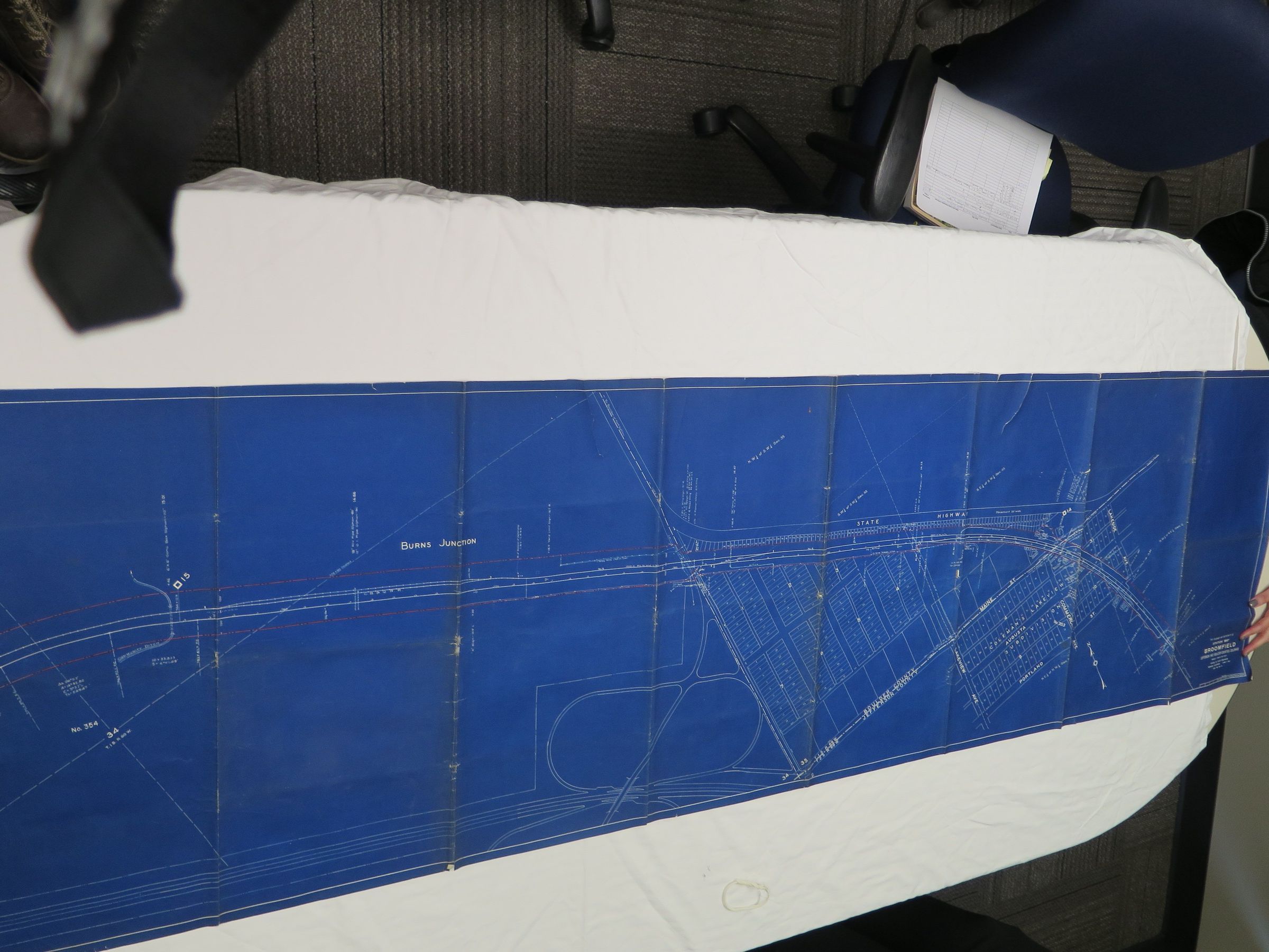 A map of the Broomfield area and railroad made by the Colorado and Southern Railway Company's Office of Chief Engineer, circa 1939. The map is 2' x 7', blueprint. The original map was created June 1, 1931. This particular copy of the map was last revised September 15, 1939, with previous revisions made January 3, 1936 and July 12, 1937. The exact date of reproduction and time of specific revisions are unknown. The scale is 1 inch = 100 feet. North is pointed at an approximate 45 degree angle to the left.