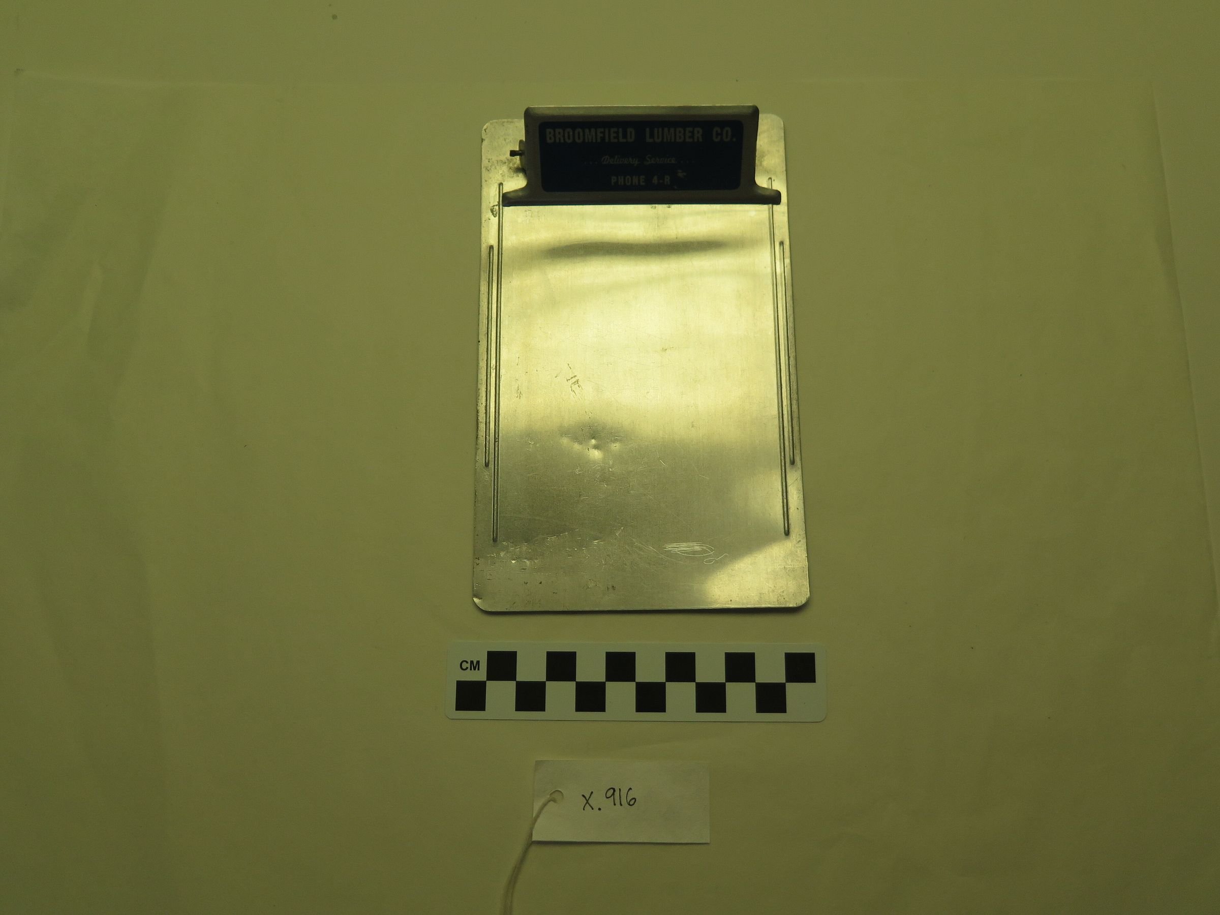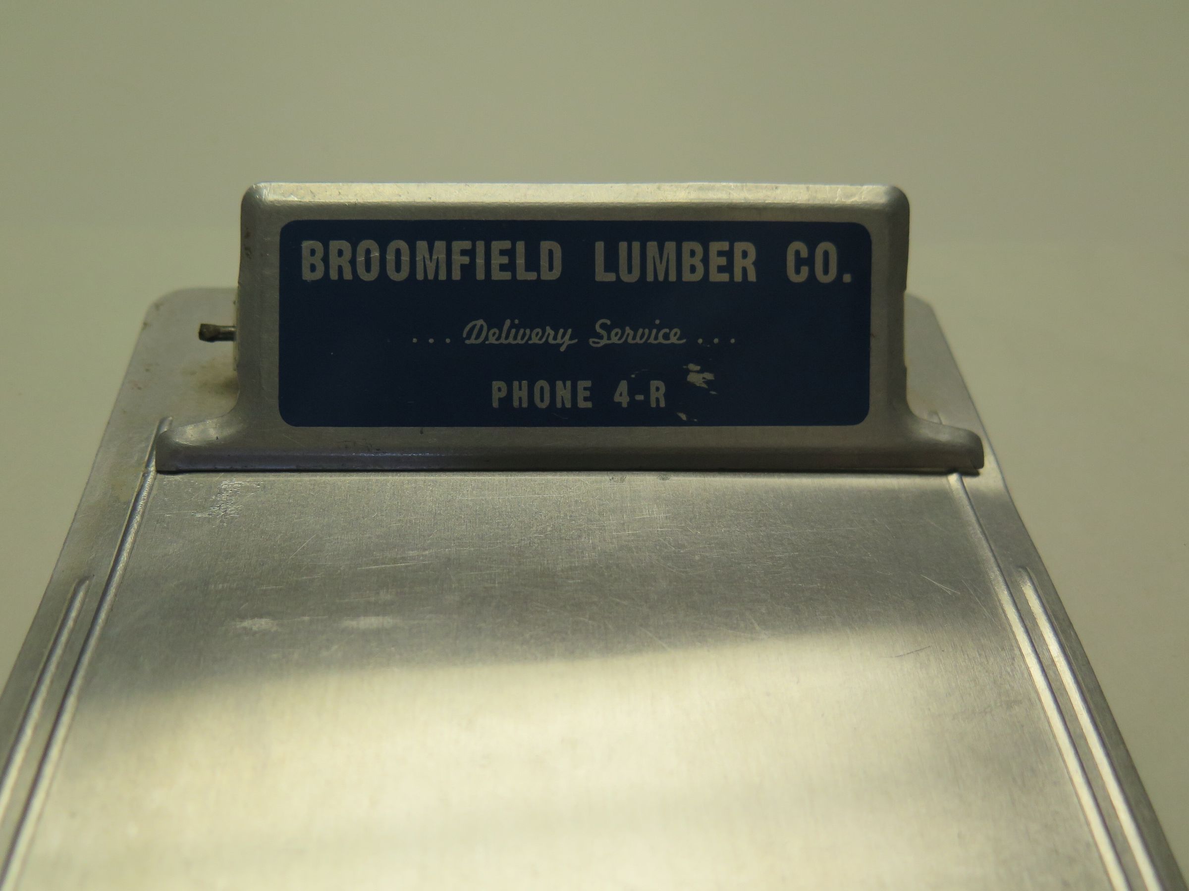 This is a metal clipboard from the Broomfield Lumber Co. The clipboard measures 4.5" (w) x 7" (l).