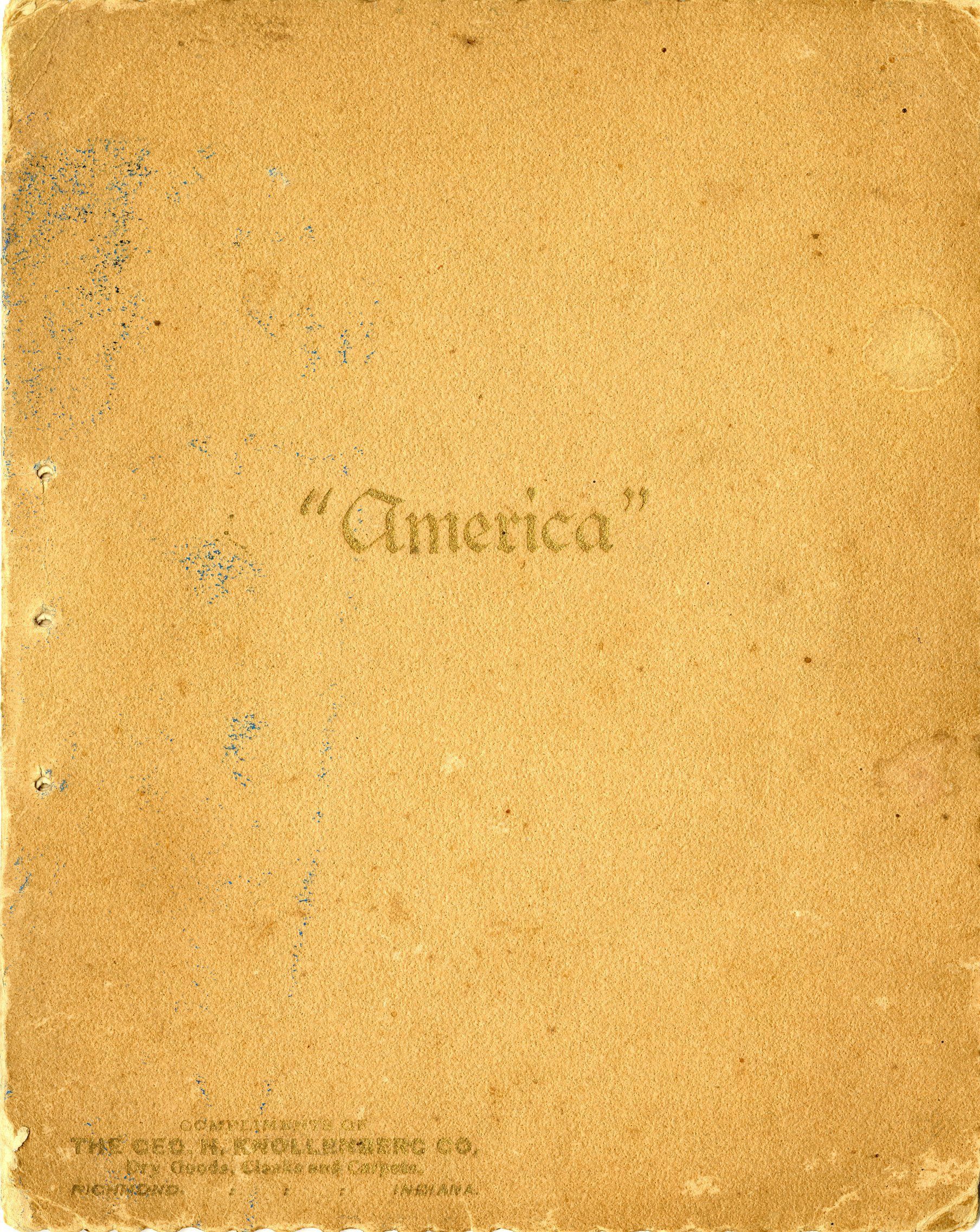 Card booklet titled "America," with Samuel Francis Smith's "America" song lyrics (also called "My Country, 'Tis of Thee") printed inside, circa 1893. The booklet is 6" x 7.5," paper with card cover, originally bound by string. The text "America" is printed on the front in gold lettering, with the text "Compliments of The Geo. H. Knollenberg Co. Dry Goods, Cloaks and Carpets, Richmond, Virginia" printed in the lower left corner. The second page has a photomechanical printed picture of Samuel Francis Smith, with printed text "Yours Sincerely, S.F. Smith 1893." All of the booklet's printed text looks like it is handwritten in ink, with lyrics to "My Country Tis of Thee." The booklet was most likely used as a promotional booklet for the George H. Knollenberg Company in the 1890s. An inscription in ink on the inside cover says "To Maudie Reid."Collection