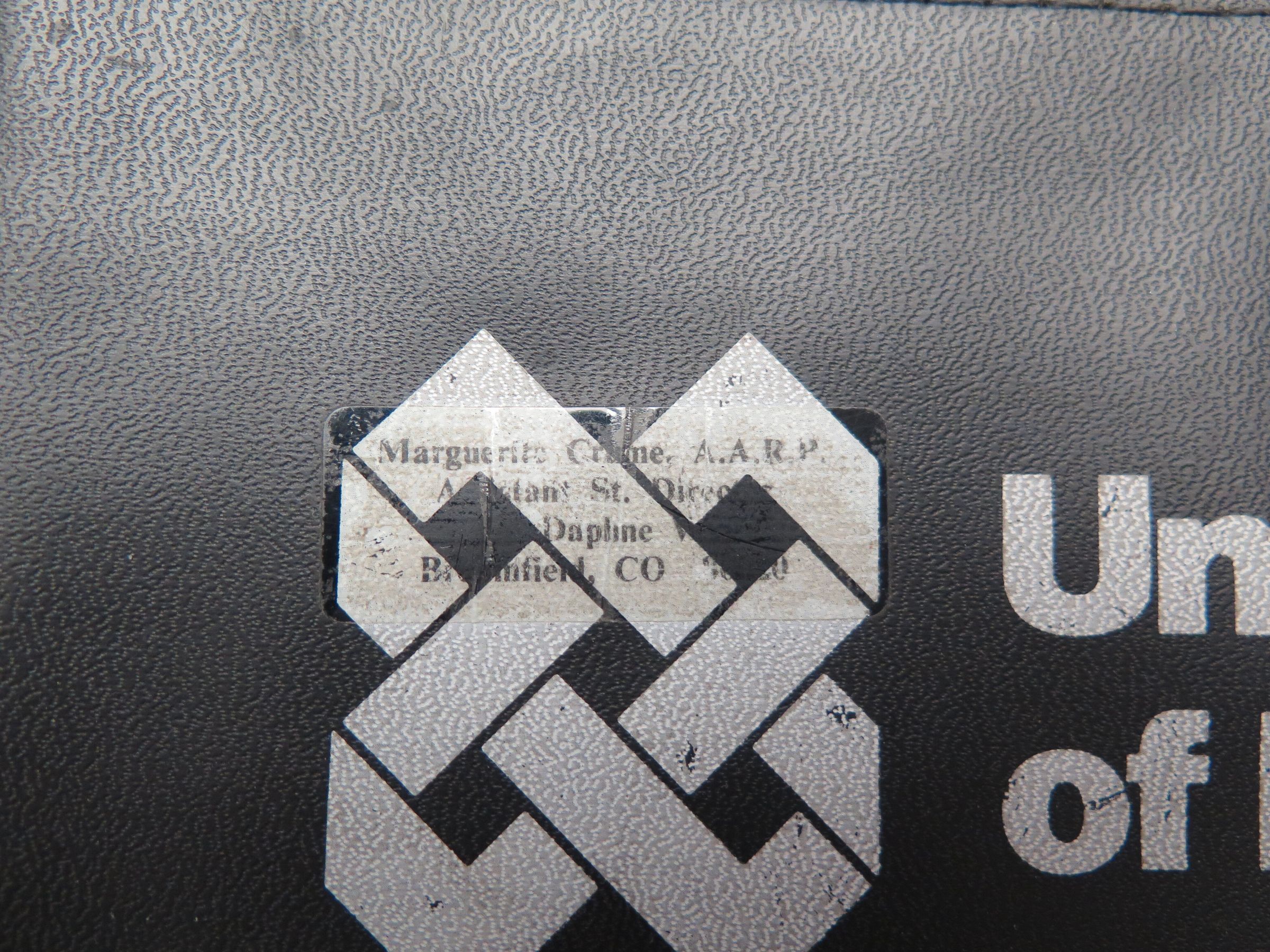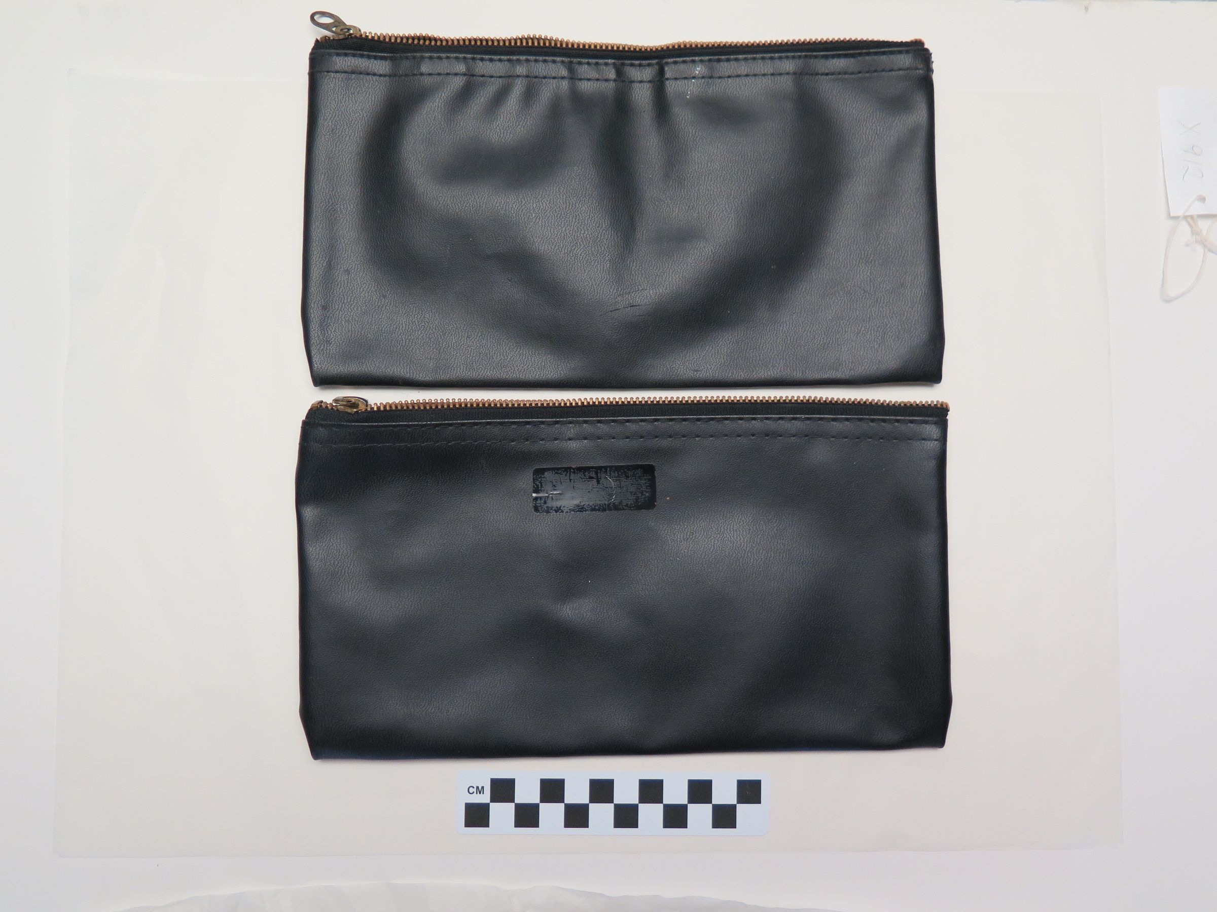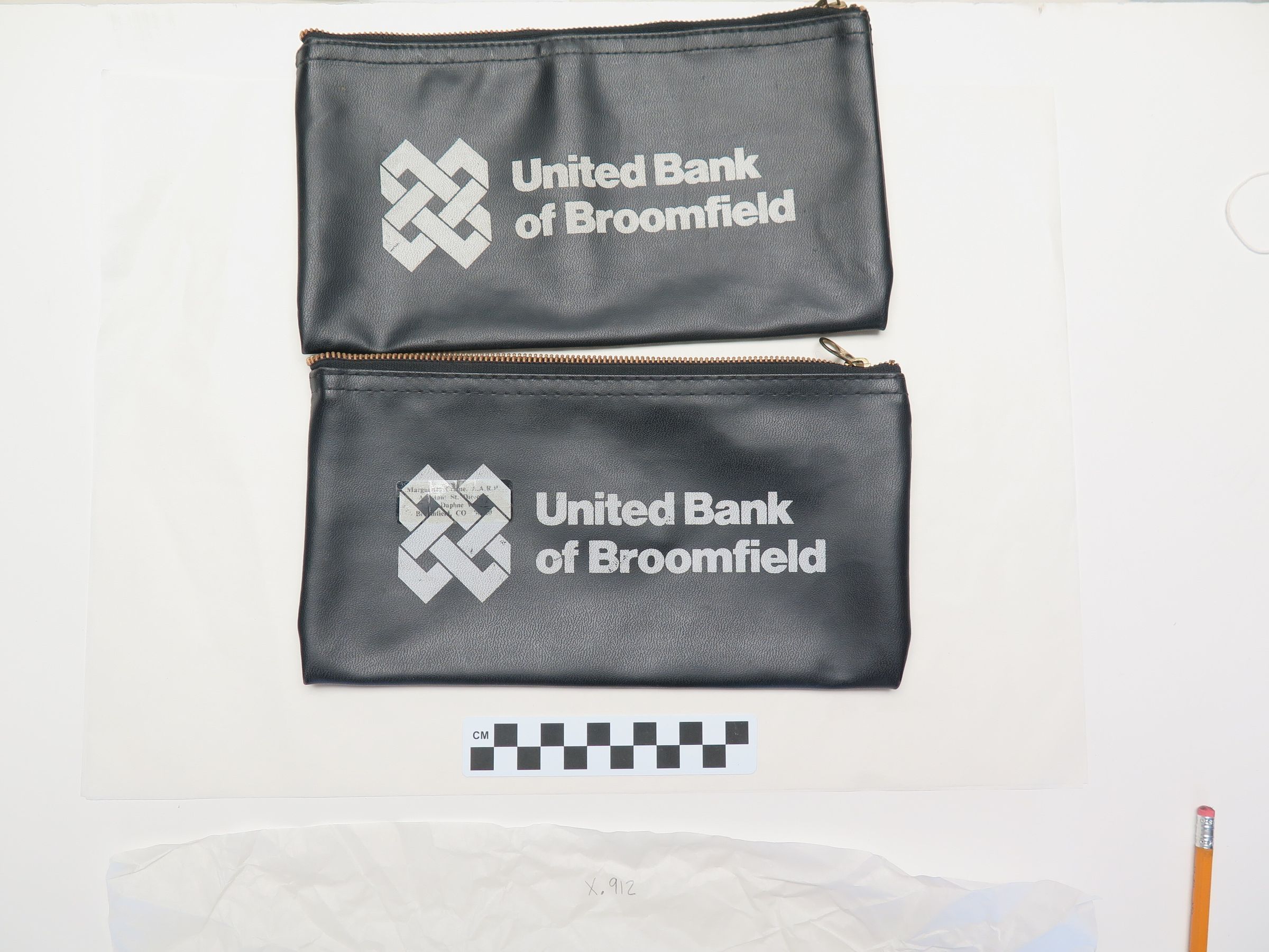 This is a set of 2 black bank bags from the United Bank of Broomfield. The bags have a zipper closure on the top. Each bag measures 10" (w) x 5.5" (l).