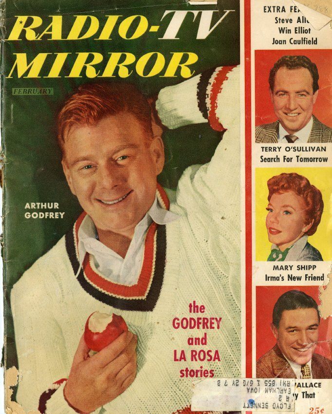 February 1954 issue of Radio-TV Mirror magazine. The magazine is 8.5" x 11", 108 pages, with staple binding. The cover is in color with a picture of broadcaster Arthur Godfrey eating an apple, with the caption "the Godfrey and La Rosa stories." The right edge of the cover has pictures of two men and a woman, with names of other articles. A mailing label in the lower right corner is addressed to a Floyd Bennett of Earlham, Iowa. The magazine's contents include articles and showtime listings about various television and radio programs in 1954, as well as several product advertisements in both black and white and some color.Collection