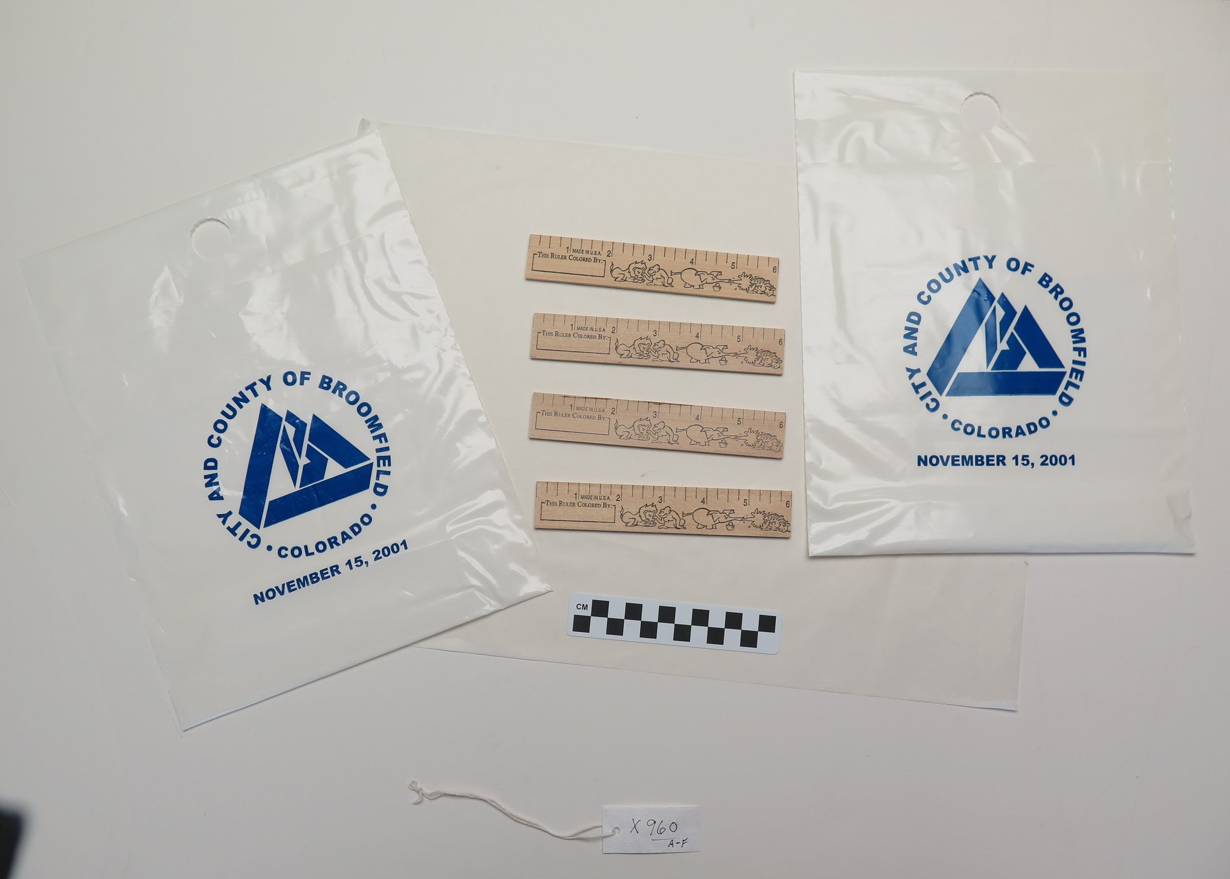 This is a set of 2 white plastic Broomfield bags that each contain 2 wood 6" (l) rulers. Each bag measures 8.5" (w) x 12" (l).