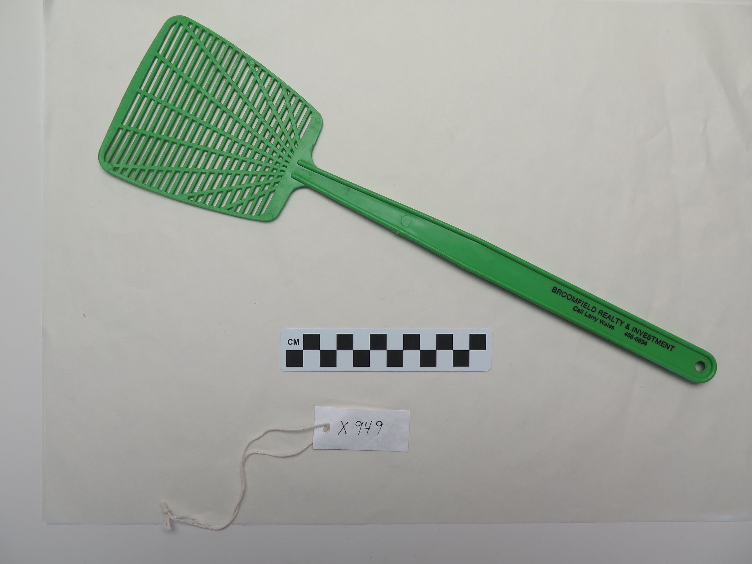 This is a green plastic fly swatter with black text on the handle advertising Broomfield Realty & Investment and providing contact information for Larry Wales. The fly swatter measures 4" (w) x 15.25" (l).