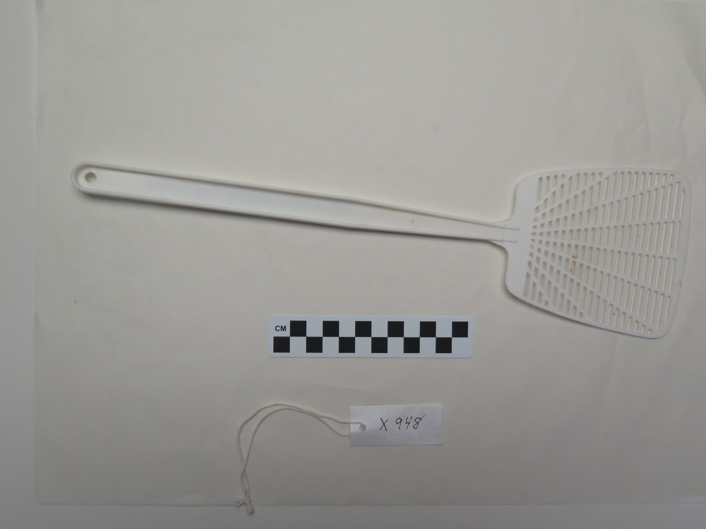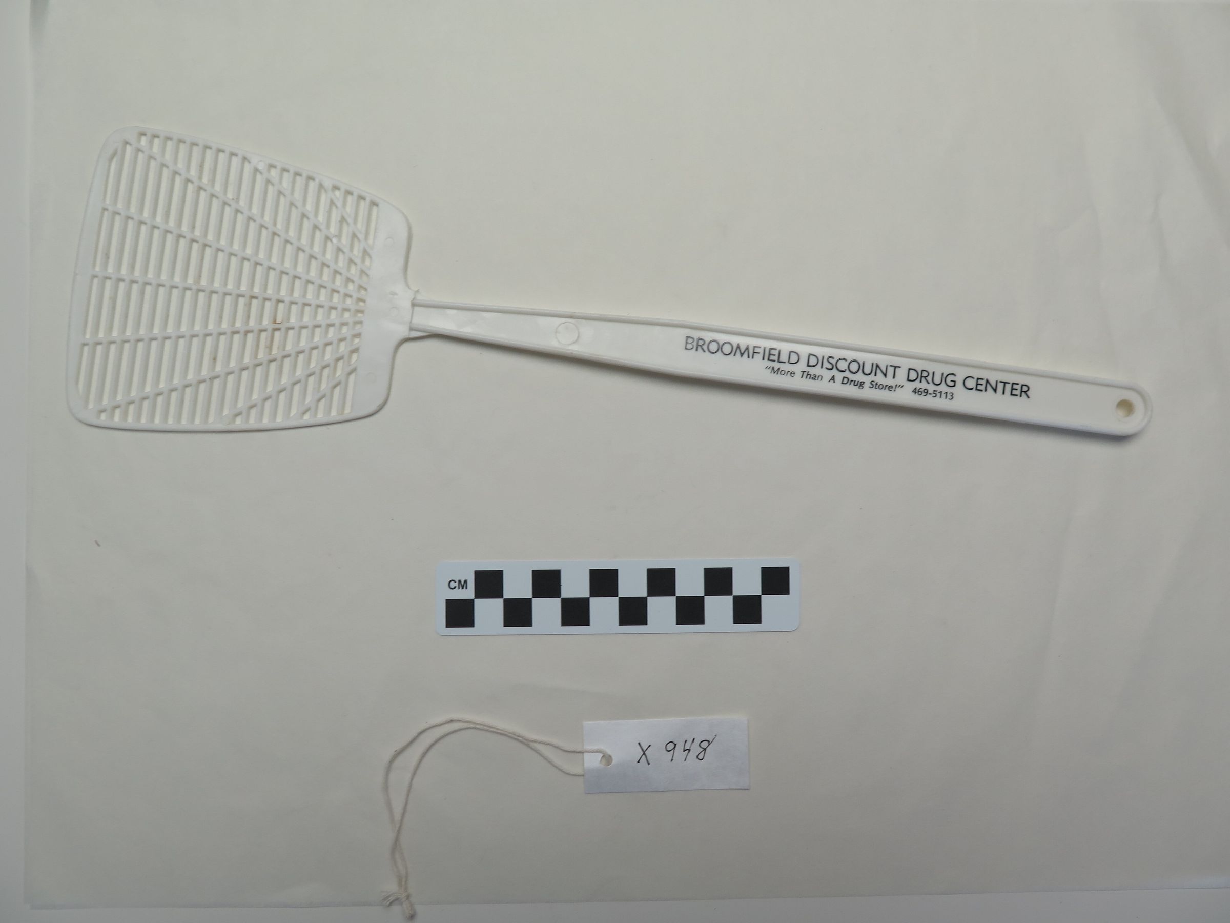 This is a white plastic fly swatter from Broomfield Discount Drug Center. The fly swatter measures 4" (w) x 15.25" (l).