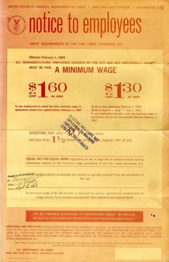 A posted legal notice to employees from the US Department of Labor about the Fair Labor Standards Act, 11" x 17", 1969. The notice informed employees of provisions concerning their minimum wage and overtime pay. The minimum wage was listed at $1.60 an hour as of February 1, 1969.