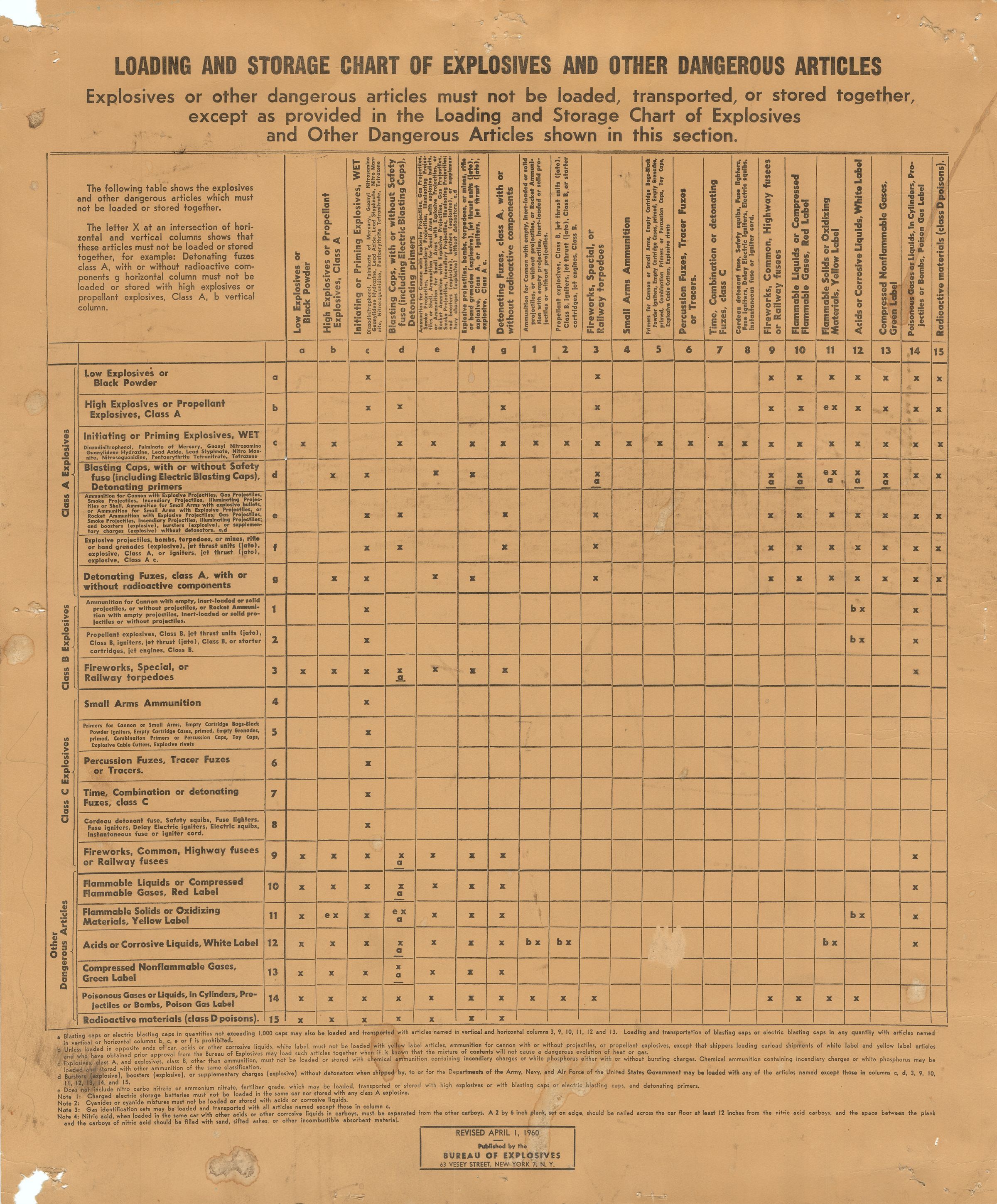 A poster chart showing different types of explosives that can be stored together and how to store them, 1960. The poster is 17" x 20.5" on card stock. It was originally published by the Bureau of Explosives in New York. The chart highlights which explosives cannot be stored or loaded together, along with a few details on how to safely store certain types of explosives. Types of explosives shown include small arms ammunition, fuzes, priming explosives, and acids.